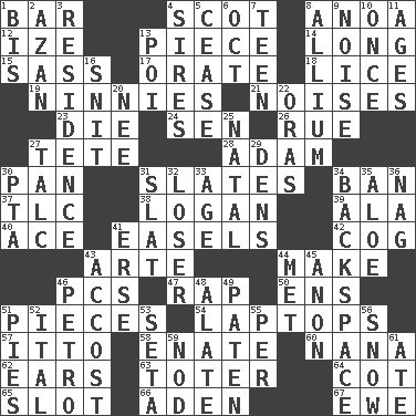 ACROSS 1. Oblong piece of solid material 4. Highlander 8. Small Philippine buffalo 12. Ending with capital 13. Component 14. Protracted 15. Backtalk 17. Declaim 18. Louse (plural) 19. Simpletons 21. Annoying sounds 23. Pass on 24. Elected rep. 26. Sorrow 27. False hair 28. First man 30. Baking dish 31. Chalkboards 34. Forbid 37. Affectionate concern, for short 38. Utah city north of Ogden 39. In the manner of 40. Adept person 41. Artist's stands 42. Gear tooth 43. Johnson of "Laugh-In" 44. Create 46. Personal Computers (abbr.) 47. Strike 50. Followers of ems 51. Parts 54. Portable computers 57. "Tell ____ the Marines!" 58. Related on the mother's side 60. Grandmother 62. Hearing organs 63. Carrier 64. Small bed 65. Narrow opening 66. Arabian gulf 67. She-sheep DOWN 1. Again 2. Muslim summons to prayer 3. Home 4. Founders of families 5. Stop 6. Sep. follower 7. Adolescent 8. Plant genus of onion and garlic 9. Annoying sound 10. At one time in the past 11. Grows older 13. Luau course 16. In a ____ (agitated or irritated) 20. Born 22. Mouths or openings 25. Brizilian seaport 27. Baby powder 29. Hiding places for outlaws 30. Parent Teacher Association (abbr.) 31. Narrow board 32. Failure 33. Grow older 34. Keyboard key 35. _ vera 36. Tired old horse 41. Celtic language 43. Buttonhole 44. Was introduced to 45. Soon (poet.) 46. Stone: prefix 48. Having winglike extensions 49. Eucharist need 51. Sliced desserts 52. Slanted text style (abbr.) 53. Stalk of a moss capsule 55. For each 56. Overwhelm 59. Dreamland 61. Had dinner
