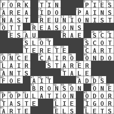 ACROSS 1. Tined utensil 5. Shallow baking pan 8. Sliced desserts 12. Type of rug 13. Wedding promise 14. Aches 15. Political cartoonist Thomas 16. One who advocates reunion 19. Baseball player Mel 20. Thinks logically 21. Son of Isaac 23. Actress Charlotte 24. _-fi 27. Narrow opening 30. Native of Scotland 31. Cylindrical with tapered ends 34. Haul 35. Single time 38. Capital of Egypt 40. Southwest Nigerian state 41. Den 42. A viewer who gazes fixedly 44. Pismires 45. Lie 46. Enemy 47. Small island 50. Does sums 53. "Death Wish" actor 57. Single 59. Census information 63. Scent 64. Clothes sense 65. Falsehood 66. Composer Stravinsky 67. Johnson of "Laugh-In" 68. Raised railways 69. Allows DOWN 1. Papal veil 2. Declaim 3. Musical pauses 4. Krazy ___ of comics 5. Hoop that covers a wheel 6. The main thing one is thinking about 7. Horse sense 8. Baking dish 9. One more than two 10. Followers of ems 11. Fast jet (abbr.) 14. Introduce or present, as a question 17. And not 18. _ tizzy (2 wds.) 20. Court order 22. Michaelmas daisies 24. Examine hastily 25. Drawstring 26. "Tell ____ the Marines!" 28. The grampus (Milton) 29. Beverages made from leaves 30. Tallied 32. Teat (slang) 33. Part of Q.E.F. 35. Norwegian king 36. Billionth: prefix 37. Quote 39. Mouth or opening 43. Flair 47. Competent 48. Lyricist Gershwin 49. Small child 51. Evade 52. Snob 54. "Death on the ____" 55. Land 56. Singles 58. Blunders 59. Parent Teacher Assoc. 60. Rowing implement 61. Pacific Standard Time (abbr.) 62. Shoshoni 63. Lubricate