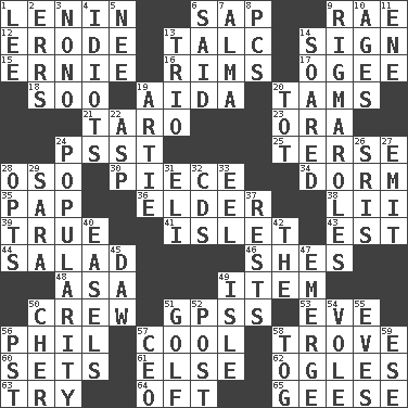 ACROSS 1. Soviet premier 1918-24 6. Plant excrement 9. Actress Charlotte 12. Eat (away) 13. Baby powder 14. Public display of a written message 15. Bert's buddy 16. Basketball hoops 17. Double curve, resembling the letter S 18. "Barney Miller" actor Jack 19. Opera by Verdi 20. Scottish caps 21. Edible starchy tuberous root 23. Mouth or opening 24. Inconspicuous attention getter 25. Laconic 28. Bear (Spanish) 30. Part 34. Dormintory (informal) 35. Infant food 36. A person who is older than you are 38. Cards in a Roman deck? 39. Loyal 41. Small island 43. Eastern Standard Time (abbr.) 44. Vegetable dish 46. "______ My Girl" (Turtles hit) 48. White ___ sheet 49. A whole individual unit 50. Group working together 51. Global Positioning Systems (abbr.) 53. Night before a holiday 56. Silvers or Donahue 57. Calm and collected 58. Collection of objects 60. Arranges properly for use 61. Otherwise 62. Stares 63. Attempt to accomplish something 64. Often (poetically) 65. Honkers DOWN 1. Area sheltered from the wind 2. Blunders 3. Words to Nanette 4. Foolish or stupid persons 5. Born 6. Stated 7. _ mater 8. Personal Computers (abbr.) 9. Frustrating wastes of time 10. Grows older 11. Compass dir. 13. Musical group of three 14. Flew 19. Nick name for Arthur 20. Small child 22. Viper 24. Teen's desire 26. Indian titles of respect 27. Give off 28. Elects 29. "Two Mules for Sister ____" 31. Biblical high priest 32. Music discs 33. Snakelike fish 37. Musical pauses 40. Artist's stands 42. Definite Article 45. Fool 47. Develop 49. Small island 50. "Mermaids" star 51. Eighteen holes 52. Mail 54. Grand slam 55. Nights before holidays 56. Pacific Standard Time (abbr.) 57. Corporate head (abbr.) 58. Coat; cloak 59. Compass dir.