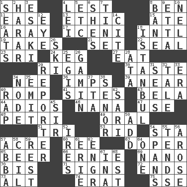ACROSS 1. A female animal or person 4. For fear that 8. Benjamin's nick name 11. Relaxation 13. Value system 15. Had dinner 16. Like ___ of sunshine 17. Ancient Celtic tribe of eastern Britain 18. International (abbr.) 19. Proceeds 21. Put into a specified state 22. Lick closed 23. _ Lanka 24. Cask 27. Consume 29. Port city in Latvia 30. Clothes sense 34. Born 36. Naughty children 39. Approach 40. Frolic 41. Locates 43. Actor Lugosi 44. Goodbye (Sp.) 46. Nanny 47. Purpose 48. _ dish (used to culture cells) 49. Spoken 51. Three (prefix) 53. To free from 54. R.R. building 57. Land measure 60. To riddle 63. Drug addict 65. Fermented drink made from hops 66. Bert's buddy 69. Billionth: prefix 70. Altar cloth linen 71. Signals 72. Conclusions 73. Keyboard modifier key 74. Part of Q.E.F. 75. Compass dir. DOWN 1. Theater features 2. Ethiopian city, capital of Harari 3. 1973 Nobel Price Winner (Physics) Leo 4. Flowery wreath 5. And so on (abbr.) 6. "______ My Girl" (Turtles hit) 7. Prong on a fork 8. Object of repulsion 9. Singer James 10. 1994 drama film starring Jodie Foster 12. Sight organ 14. Quote 18. Byzantium, centuries later 20. What Jean-Claude Killy likes to do 25. The front part of a cuirass 26. Homeless child 28. _ moment's notice (2 wds.) 29. Newsperson 31. Observes 32. Falsehood 33. Epoch 34. Connecting point 35. Send forth 37. Parent Teacher Association (abbr.) 38. Sir (Sp.) 40. Hit sharply and swiftly 42. Indian skirt 45. Title for a knight 50. Increase 52. Angers 54. Connects, as a bridge 55. Looks after 56. Came up 57. Swedish rock group 58. To provide with a ceiling 59. Repose 61. One of the Great Lakes 62. Engineer (abbr.) 64. Single 67. _ tizzy (2 wds.) 68. Eastern Standard Time (abbr.)