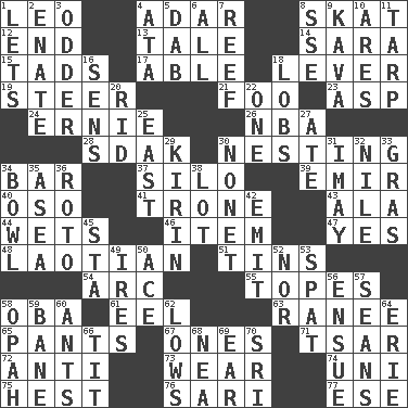 ACROSS 1. Lion 4. The sixth month of the Jewish calendar 8. Three-handed card game 12. Conclude 13. Lie 14. "Two Mules for Sister ____" 15. Bits 17. Competent 18. Prying instrument 19. Navigate 21. Egg _ yung 23. Viper 24. Bert's buddy 26. Basketball assoc. 28. Neighbor of Neb. 30. Nestling 34. Tavern 37. Grain storage tower 39. Arab leader 40. Bear (Spanish) 41. Marketplace scale 43. Insect wing 44. Soaks 46. Detail 47. It is so 48. Of or relating to Laos or its people 51. Airtight sealed metal containers 54. Curve 55. Drinks excessively 58. Chief or king in Benin or Nigeria 61. Snakelike fish 63. The wife of a rajah (variant) 65. Leg coverings 67. Washington bills 71. Russian ruler of old 72. Opposed to 73. Erode 74. Single; one (prefix) 75. Behest 76. Indian skirt 77. Compass dir. DOWN 1. Allows 2. Related on the mother's side 3. More peculiar 4. _ moment's notice (2 wds.) 5. Small moist lump or mass 6. Everything 7. Coral collection 8. Compass dir. 9. Polynesian shrub of the pepper family 10. Ancient Greek god of war 11. Canvas cover 16. Elected reps. 18. Tennis shots 20. To free from 22. Single 25. Compass direction 27. Had dinner 29. Japanese brewing company 30. Music written for nine 31. "If ____ say so..." 32. Mediterranean tributary 33. Pate de foie ____ 34. Soup holder 35. At sea 36. Printing process, for short 38. Car dealer's back yard 42. Give off 45. R.R. building 49. Angers 50. Adept person 52. Not either 53. Petty quarrel 56. Follow as a consequence or result 57. Seines 58. Brightly colored fish 59. Object of repulsion 60. Pismires 62. Coldest temperatures 64. 4th largest of the Great Lakes 66. Teat (slang) 68. Teachers' org. 69. Hearing organ 70. Indian title of respect (Mr.)