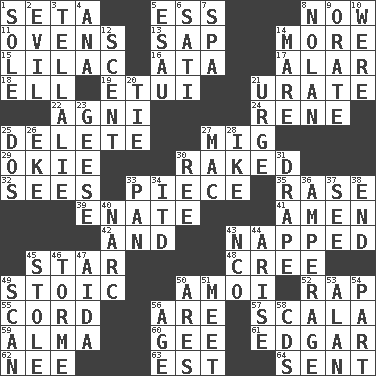 ACROSS 1. Stalk of a moss capsule 5. Double-curved letter 8. At this time 11. Baking chambers 13. Plant excrement 14. Greater amount 15. Pale purple color 16. "One Day ___ Time" 17. Having or resembling wings 18. Pipe bend 19. Needle holder 21. A salt of uric acid 22. Hindu god of fire 24. French philosopher Descartes 25. Keyboard key 27. Russian fighter aircraft 29. Migrant worker of the '30s 30. Moved through 32. Observes 33. Part 35. To erase 39. Related on the mother's side 41. So be it 42. Plus 43. Slept 45. Play the lead 48. Algonquian 49. Unemotional 50. Mine, in Marseilles 52. Strike 55. Drawstring 56. "We ___ not amused" (Victoria) 57. Any of the three canals of the cochlea 59. _ mater 60. Unit of force equal to gravity 61. _ Allan Poe 62. Born 63. Eastern Standard Time (abbr.) 64. Emitted DOWN 1. Not divided or shared with others 2. Tending to cause great harm 3. Copy Pinocchio 4. Santa ___, CA 5. Son of Isaac 6. Suttee (variant) 7. Health resort 8. Pitcher Ryan 9. Speak pompously 10. Past tense of be (plural) 12. Aroma 14. Female horse 20. Neckwear 21. Goad 23. Honkers 25. Two (Sp.) 26. Make supply last 27. Apple computer (short form) 28. Mamie's mate 30. To separate or throw off 31. Window treatment 33. Baking dish 34. It would 36. Electrical Measurement 37. Perceive with the eye 38. Conclude 40. Drug cop 43. Non-commissioned officer (abbr.) 44. Ascend 45. Fur scarf 46. Singer Mel 47. Opera by Verdi 49. Examine minutely or intensely 50. Ancient Greek god of war 51. Rendezvous 53. Actor Alda or Thicke 54. Component 56. Personal question 58. Music discs