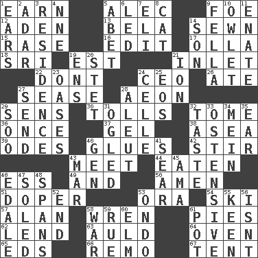 ACROSS 1. Merit 5. Actor Baldwin 9. Enemy 12. An important port of Yemen 13. Actor Lugosi 14. Stitched 15. To erase 16. Prepare for publication 17. Spanish pot 18. Indian title of respect (Mr.) 19. Eastern Standard Time (abbr.) 21. An arm off of a larger body of water 22. Do not 24. Corporate head (abbr.) 26. Had dinner 27. Gospel singer Marvin 28. A really long time 29. Elected reps. 30. For Whom the Bell _____ 32. Heavy book 36. Single time 37. Set 38. Toward the sea 39. Lyric poems 40. Adhesives 42. Tumult 43. Rendezvous 44. Eroded 46. Curvy letter 49. Added to 50. So be it 51. Drug addict 53. Mouth or opening 54. What Jean-Claude Killy likes to do 57. ____ Jay Lerner 58. Songbird 61. Sliced desserts 62. Grant temporary use of 63. Old (Scot.) 64. Baking chamber 65. Begley and Asner 66. San ____ (Riviera town) 67. Portable shelter DOWN 1. Hearing organs 2. The sixth month of the Jewish calendar 3. Dwelling 4. Compass dir. 5. Collude with 6. Directed 7. Connecticut Ivy Leaguer 8. Domesticated feline 9. Chap (slang) 10. A small or young owl 11. Related on the mother's side 14. Boy, to dad 19. Followers of ems 20. Proofreading order 21. Electrically charged atom 23. Fertile tracts in a desert 24. Cell (Danish) 25. Greek goddess of the dawn 27. Post 28. Native American of Southwest Alaska 29. "Barney Miller" actor Jack 31. Stared at amorously 32. Clothes sense 33. Clearly or manifestly demonstrative 34. Chow _ 35. Ewer handle 40. Commissioned military rank (abbr.) 41. Shrivel 43. Make imperfect 45. Nursemaid (var.) 46. Peak District village in England 47. Having a sole or soles 48. Connects, as a bridge 52. Conclude 53. Southwest Nigerian state 55. Peachy ____! 56. Is not 58. Armed conflict 59. Sorrow 60. Shade tree 61. Plant holder