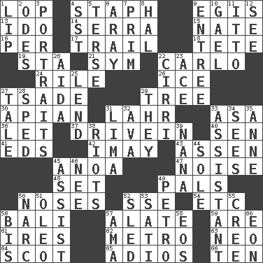 ACROSS 1. Trim (branches) 4. Staphylococcus 9. Armor plate that protects the chest 13. Wedding promise 14. Father Junipero _ 15. Nathan's nickname 16. For each 17. Drop behind 18. False hair 19. R.R. building 21. Symbol (abbr.) 22. Monte _, Las Vegas Hotel/Casino 24. Cause heat under the collar 26. Frozen water 27. Sadhe (variant) 29. Relationship diagram 30. Bee-related 31. Cowardly lion portrayer 33. White ___ sheet 36. Allow 37. Popular '50s hangout 40. Elected rep. 41. Begley and Asner 42. "If ____ say so..." 43. NE Netherlands city 45. Small Philippine buffalo 47. Annoying sound 48. Put into a specified state 49. Friends 50. Olfactory organs 52. Compass dir. 54. And so on (abbr.) 56. Indonesian resort city 57. Having winglike extensions 59. "We ___ not amused" (Victoria) 61. Angers 62. Paris' subway 63. Modern: prefix 64. Native of Scotland 65. Goodbye (Sp.) 66. "___ Little Indians" DOWN 1. Mouth edge 2. Lyric poems 3. Likenesses of persons 4. Fast jet (abbr.) 5. Laconic 6. Like ___ of sunshine 7. Demure 8. Actor Linden 9. Main course 10. Highlander 11. "Tell ____ the Marines!" 12. Perceive with the eye 20. Opera by Verdi 22. High-altitude cloud 23. Adept person 25. Grant temporary use of 27. Lie 28. Drove too fast 29. Those things 31. Pale green bean 32. Actress Gardner 33. Helper 34. Observes 35. Singer Murray 38. Debaucheries 39. Nanny 44. Flatfish 45. Help 46. Born 49. Stone: prefix 50. Drug cop 51. Margarine 52. Downhill vehicle 53. Suttee (variant) 55. Algonquian 56. Twice 57. Nanny (var.) 58. Greek goddess of the dawn 60. A really long time