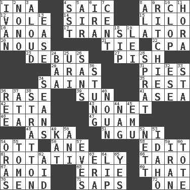 ACROSS 1. _ tizzy (2 wds.) 4. Ketch in the Levant 8. Bowlike part 12. Short-tailed, large-bodied rat 14. Father 15. _ and Stitch 16. Small Philippine buffalo 17. Interpreter 20. Good sense 21. Neckwear 22. Numbers guy (abbr.) 23. Alight from a bus 27. Expression of disdain 29. Ancient river in northeast Turkey 31. Sliced desserts 34. Inhabitant of Heaven 35. Remainder 36. To erase 39. Player for Phoenix 41. Toward the sea 42. Singer James 43. Music written for nine 46. Merit 47. Island territory of the United States 48. "____ silly question..." 51. Group of southern Bantu languages 54. Baseball player Mel 56. A saturated hydrocarbon 58. Prepare for publication 61. Producing rotation 66. Edible starchy tuberous root 67. Mine, in Marseilles 68. 4th largest of the Great Lakes 69. Not this but _ 70. Post 71. Plant excrements 72. Single DOWN 1. _ the terrible 2. Words to Nanette 3. Verbally 4. Fast jet (abbr.) 5. Atmosphere 6. Retirement account (abbr.) 7. Penny 8. Wing 9. Actors Guy, Robert Welles, and Clint 10. Hoof sound 11. Israeli folk dance 13. Comfort 18. Small drink 19. Flowery wreath 24. Sound made by sheep 25. RI univ. 26. Without 28. Small fatty European fish 30. Feeling sharp psychological pain 32. Compass dir. 33. R.R. building 34. Actors Connery and Penn 36. To sift 37. _ moment's notice (2 wds.) 38. Ski resort town in Vermont 40. Part of speech 44. Tired old horse 45. Australian flightless bird 49. Krazy ___ of comics 50. Black tropical American cuckoo 52. Remaining after all deductions 53. Potato state 54. Mouths or openings 55. Heavy book 57. Nights before holidays 59. SW Asia republic 60. Haul 62. Help 63. Epoch 64. Mouth edge 65. It is so