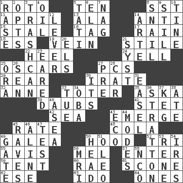 ACROSS 1. Printing process, for short 5. Nine, plus one 8. Fast jet (abbr.) 11. Showery time 13. According to 14. Opposed to 15. Having lost freshness 16. Label 17. Water falling in drops from the sky 18. Double-curved letter 19. Distinctive style or manner 21. Vertical member of a panel or frame 22. The bottom of a shoe or boot 24. Shout 25. Motion picture awards 27. Personal Computers (abbr.) 29. Posterior 30. Feeling or showing extreme anger 32. Queen of England 1702-14 33. Carrier 35. "____ silly question..." 39. Applies to a surface 41. Proofreading order 42. Ocean 43. Develop 45. Assign a rank or rating to 48. Root beer relative 49. An organ shaped like a helmet 50. Parka part 52. Three (prefix) 55. Deliberation 56. Cartoonist voice _ Blanc 57. Keyboard key 59. Portable shelter 60. Actress Charlotte 61. Biscuitlike quick bread 62. Compass dir. 63. Wedding promise 64. Washington bills DOWN 1. Raze (variant) 2. Elects 3. File 13 4. Lubricate 5. Jacques of French films 6. Liveliness 7. Tired old horse 8. Slow-paced one 9. Free of sound 10. Prong on a fork 12. Prying instrument 14. Johnson of "Laugh-In" 20. Raised railways 21. System (abbr.) 23. Having ears or earlike features 25. Mouth or opening 26. Elected rep. 27. Before (prefix) 28. Automobile 30. It is 31. Artist's stand 33. Third day of the wk. 34. Chief or king in Benin or Nigeria 36. Ski resort town in Vermont 37. Barrel 38. Had dinner 40. At sea 43. Environmental prefix 44. Methods 45. All-night dance parties 46. Place in a line 47. Trial 49. Yard entry 50. Froth on beer 51. Margarine 53. French philosopher Descartes 54. Angers 56. Medical imaging device (abbr.) 58. Non-commissioned officer (abbr.)