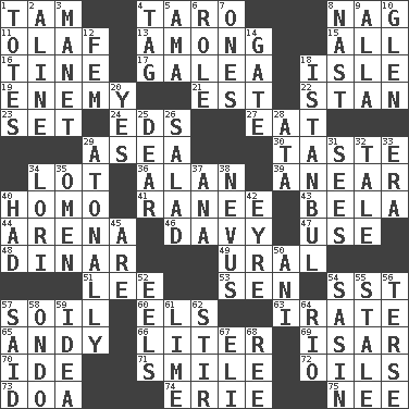ACROSS 1. Scottish cap 4. Pacific island yam 8. Tired old horse 11. Norwegian king 13. Amid 15. Everything 16. Prong on a fork 17. An organ shaped like a helmet 18. Small island 19. Foe 21. Eastern Standard Time (abbr.) 22. Comedian Laurel of Laurel & Hardy 23. Arrange properly for use 24. Begley and Asner 27. Ingest 29. At sea 30. Clothes sense 34. Car dealer's back yard 36. ____ Jay Lerner 39. Approach 40. Same (prefix) 41. The wife of a rajah (variant) 43. Actor Lugosi 44. Sports stadium 46. _ Jones' Locker 47. Purpose 48. Middle Eastern gold or silver currency 49. Mountain range 51. Area sheltered from the wind 53. Elected rep. 54. Fast jet (abbr.) 57. Land 60. Raised railways 63. Feeling or showing extreme anger 65. Actor Griffith 66. 61 cubic inches 69. Austrian river, tributary to the Danube 70. Binary compound 71. Grin 72. Petroleums 73. ___ good deed 74. 4th largest of the Great Lakes 75. Born DOWN 1. Lugs 2. Place in a line 3. French painter Edouard 4. Label 5. Housemaid (var.) 6. Hero or heavy, e.g. 7. Singles 8. Political cartoonist Thomas 9. Silent film actress Nazimova 10. Small, secluded valley 12. Opposite of masc. 14. Yard entry 18. Byzantium, centuries later 20. Consenting reply 25. Letter starter 26. First course 28. _ moment's notice (2 wds.) 29. Without tonality 31. Observes 32. Story 33. Period 34. Australian parrot (variant) 35. Sign of things to come 37. Santa ___, CA 38. Congenital growth or mark on the skin 40. Possessed 42. Jane of fiction 45. "We ___ not amused" (Victoria) 50. Cuckoo 52. Snakelike fish 54. Indian antelope 55. Lacking originality or spontaneity 56. Laconic 57. Stated 58. Southwest Nigerian state 59. The content of cognition 61. Welles in "The Third Man" 62. Tumult 64. River (Sp.) 67. Biblical high priest 68. Portuguese money of account (variant)