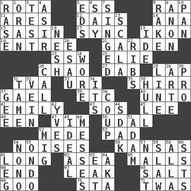 ACROSS 1. Roll call or roster of names 5. Double-curved letter 8. Reproach for some lapse or misdeed 11. Ancient Greek god of war 12. Raised platform 14. Santa ___, CA 15. Indian antelope 17. Synchronize (abbr.) 18. Visual representation of an object 19. Main course 21. Place where plants grow 23. Compass dir. 25. Writer Wiesel 26. US Secretary of Labor Elaine L. _ 27. Small moist lump or mass 28. Pet locale 31. Federal power corp. 33. RI univ. 35. Bake eggs in their shells 37. Highlander 38. And so on (abbr.) 40. To (old English) 41. Poet Dickinson 43. Distress signal 45. Area sheltered from the wind 46. Car or cant ending 47. Zeal 50. Allodial 52. Ancient Persian 53. Writing tablet 54. Annoying sounds 56. Sunflower state 61. Having great length 62. At sea 65. Promenades 66. Conclusion 67. Path through which fluid escapes 68. Table seasoning 69. Thick or sticky substance 70. R.R. building 71. It was, poetically DOWN 1. Raze (variant) 2. Northwest Algerian city 3. Trial 4. SW Saudi Arabia district 5. Begley and Asner 6. Declare 7. Scorched 8. Libertine 9. Soon (poet.) 10. Baking dish 13. Any of the three canals of the cochlea 16. Soft 18. Binary compound 20. He sold his birthright 22. Teases 24. Had on 26. Give a ring to 28. Actor's bit 29. Johnson of "Laugh-In" 30. Adept person 31. Docile 32. Distinctive style or manner 34. It is 36. Frame or body of a ship 37. Unit of force equal to gravity 39. Clever action or accomplishment 42. Jacques Cousteau's middle name 44. Neighbor of Neb. 48. Standard of perfection 49. Makes clutter 51. First of billions? 52. Russian fighter aircraft 54. Words to Nanette 55. Southwest Nigerian state 57. Political cartoonist Thomas 58. Cole _ (cabbage dish) 59. Silent film actress Nazimova 60. Fast planes 61. Part of a journey 63. Consume 64. Alias (abbr.)