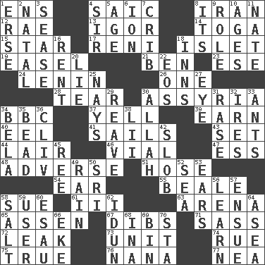 ACROSS 1. Followers of ems 4. Ketch in the Levant 8. SW Asia republic 12. Actress Charlotte 13. Composer Stravinsky 14. Ancient Roman robe 15. Play the lead 17. Painter Guido (1575-1642) 18. Small island 19. Artist's stand 21. Benjamin's nick name 23. Compass dir. 24. Soviet premier 1918-24 26. Single 28. Pull into pieces 30. Nineveh was its capital 34. English channel? 37. Shout 39. Merit 40. Snakelike fish 41. Travel by water 43. Put into a specified state 44. Den 46. Small bottle 47. Curvy letter 48. Contrary to your interests or welfare 51. Stockings 54. Ewer handle 55. Calif. Air Force Base 58. Take to court 61. One more than two 63. Sports stadium 65. NE Netherlands city 67. Claim 71. Backtalk 72. Path through which fluid escapes 73. A single undivided whole 74. Regret 75. Loyal 76. Grandmother 77. Teachers' org. DOWN 1. Celtic language 2. Relating to or accompanying birth 3. Gospel singer Marvin 4. Title for a knight 5. Mature 6. Electrically charged atom 7. Baby bed with high sides 8. ___ a Wonderful Life 9. Hero or heavy, e.g. 10. Eras 11. Nathan's nickname 16. Monthly bill 18. Restaurants 20. Whopper 22. Greek goddess of the dawn 25. Negative votes 27. Sight organ 29. Break or tear apart 30. Assad's deity 31. To erase 32. Angers 33. Pismires 34. Actor Lugosi 35. Necklace unit 36. 154 in Roman numerals 38. Cards in a Roman deck? 42. Oscar Madison type 45. To sift 49. Water falling in drops from the sky 50. _ Lanka 52. Ocean 53. Hearing organs 56. Acquire or gain knowledge or skills 57. Follow as a consequence or result 58. Table seasoning 59. One who uses or employs something 60. Son of Isaac 62. Goddess of spring and wife of Bragi 64. At sea 66. Make supply last 68. _ tizzy (2 wds.) 69. Storage container 70. R.R. building