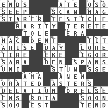 ACROSS 1. Conclusions 5. Had dinner 8. Bear (Spanish) 11. Ooze 12. Examine hastily 13. Tired old horse 14. A viewer who gazes fixedly 17. One of the two male reproductive glands 19. Noteworthy scarcity 21. Cylindrical with tapered ends 22. Lacquered or enameled metalware 23. Period 24. Apple computer (short form) 27. Scratch 29. Teat (slang) 32. Get up 34. 24 hours 36. Old wives' tales, e.g. 37. Become fatigued 38. Make supply last 39. Russian composer Stravinsky 40. "Two Mules for Sister ____" 41. Lair 42. Connects, as a bridge 43. Single; one (prefix) 44. Astound 46. Compass dir. 47. Nanny (var.) 50. Afresh 52. Declaimed 55. Michaelmas daisies 57. Conveyance 59. Threatening words 62. Followers of ems 63. Round or rotation of duties 64. Within a short period 65. "Barney Miller" actor Jack 66. Eastern Standard Time (abbr.) 67. Watch over DOWN 1. Curvy letter 2. Fish or hair follower 3. Letter starter 4. Small fatty European fish 5. Adept person 6. Clothes sense 7. Keyboard key 8. At one time in the past 9. Table seasoning 10. Double curve, resembling the letter S 12. Filthy place 15. Wear away 16. Cause heat under the collar 18. Retirement account (abbr.) 20. Looked after 24. Taiwanese island in East China Sea 25. Believer in; advocate of (suffix) 26. High-altitude cloud 28. Proceeds 29. Ancient Roman robes 30. Removes the wrinkles 31. Laconic 33. Ocean 35. Gossips 36. Mouth edge 42. Contemptuous expression 45. To (old English) 47. _ moment's notice (2 wds.) 48. Distance measurement (Brit.) 49. Goodbye (Sp.) 51. Obtain by seizing forcibly or violently 52. Lyric poems 53. Former U.S. Attorney General Janet 54. In addition 55. Santa ___, CA 56. A type of plum 58. Baseball player Mel 60. Boy, to dad 61. Conclusion