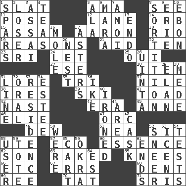 ACROSS 1. Narrow board 5. Nanny (var.) 8. Observe 11. Airs 12. Unable to walk 14. Globe 15. Indian state 17. Composer Copland 18. River (Sp.) 19. Thinks logically 21. Help 22. Nine, plus one 23. _ Lanka 24. Allow 25. Fr. "Yes" 27. Compass dir. 28. A whole individual unit 31. Old wives' tales, e.g. 35. Three (prefix) 37. "Death on the ____" 38. Angers 39. What Jean-Claude Killy likes to do 41. Frog relative 42. Political cartoonist Thomas 43. Period 45. Queen of England 1702-14 46. Writer Wiesel 47. The grampus (Milton) 49. Morning condensation 51. Teachers' org. 52. Be seated 55. Shoshoni 57. Environmental prefix 60. Substance 62. Manchild 63. Swept the length of 65. Leg joints 66. And so on (abbr.) 67. Blunders 68. Incision 69. To sift 70. Make lace 71. Indian titles of respect DOWN 1. Practice fights 2. Failure 3. Slender Brazilian palm 4. Beverages made from leaves 5. Insect wing 6. Hindu Mythology: god of death 7. Mine, in Marseilles 8. Drawing lots 9. 4th largest of the Great Lakes 10. Inky black, to poets 13. Inside; within (prefix) 16. Undercover agent 17. Michaelmas daisies 20. A home for chicks 26. National forest in Provo, Utah 29. Enthusiasm 30. Ancient Persian 31. Actor's bit 32. Of the mouth 33. Dwelling 34. First name in cosmetics 36. Mamie's husband 40. Pressed 44. Ancient Greek god of war 48. Keg 50. Past tense of be (plural) 52. Scornful expression 53. Ancient Celtic tribe of eastern Britain 54. Trials 55. One who uses or employs something 56. Carry 58. Heavy open wagon 59. Gumbo ingredient 61. Extremities 64. Eastern Standard Time (abbr.)