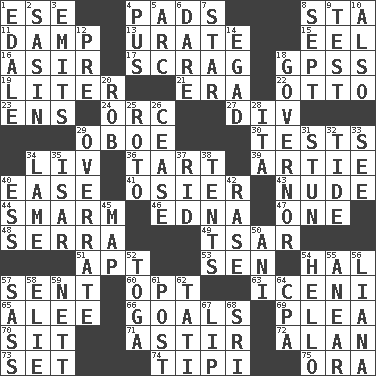 ACROSS 1. Compass dir. 4. Writing tablets 8. R.R. building 11. Moist 13. A salt of uric acid 15. Snakelike fish 16. SW Saudi Arabia district 17. Strangle with an iron collar 18. Global Positioning Systems (abbr.) 19. 61 cubic inches 21. Period 22. Von Bismarck 23. Followers of ems 24. The grampus (Milton) 27. HTML Container Element 29. Mitch Miller's instrument 30. Trials 34. 54 in ancient Rome 36. Small pie 39. Nick name for Arthur 40. Relaxation 41. Flexible twig of a willow tree 43. Naked 44. Excessive but superficial compliments 46. Pulitzer Prize-winning author Ferber 47. Single 48. Spanish missionary in California 49. Russian ruler of old 51. Fitting 53. Elected rep. 54. Actor Linden 57. Posted 60. Choose 63. Ancient Celtic tribe of eastern Britain 65. Toward shelter 66. Purposes of endeavors 69. Entreaty 70. Be seated 71. Being in motion 72. ____ Jay Lerner 73. Arrange properly for use 74. Native american tent (variation) 75. Mouth or opening DOWN 1. Peak District village in England 2. Indian antelope 3. Gives off 4. Tenth month of the Hindu calendar 5. Curve 6. Have the gumption 7. Play the lead 8. Back-to-school mo. 9. Trial 10. In addition 12. Before (prefix) 14. Mild oath 18. State head 20. Director Reiner 25. Printing process, for short 26. Stop 28. Call ___ day 29. Make much ado about nothing 31. Surprise greatly 32. Periodic rise and fall of the sea level 33. Perceive with the eye 34. Unable to walk 35. Austrian river, tributary to the Danube 37. To free from 38. Portable shelters 40. Double-curved letter 42. Raze (variant) 45. Atlas unit 50. Cuckoo 52. Ancient Roman robe 54. Phone greeting 55. Approach 56. Climbing, woody, usually tropical vines 57. Backtalk 58. Writer Wiesel 59. Remaining after all deductions 61. Mail 62. Jacques of French films 64. Accounting whiz (abbr.) 67. Mouth edge 68. Indian title of respect (Mr.)