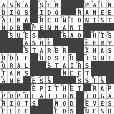 ACROSS 1. "____ silly question..." 5. Elected rep. 8. Inside of hand 12. "Vaya con ____" 13. Wedding promise 14. Indian princess (variant) 15. _ mater 16. One who advocates reunion 19. Disorderly crowd 20. Pre-World Series prize 21. Institutes legal proceedings 23. E Mali city 24. Part of HMS, perhaps 27. American tennis player Robert 30. Suggestive of the supernatural 31. A viewer who gazes fixedly 34. Dec. holiday 35. Hero or heavy, e.g. 38. Administered medicine 40. Is not 41. Taken by mouth 42. Flight of steps 44. Scottish caps 45. Confront 46. One (Scot) 47. Curvy letter 50. Fast planes 53. Curse 57. Hit sharply and swiftly 59. Census information 63. Ancient Roman robe 64. Disturbances 65. Lower and raise head in agreement 66. Nights before holidays 67. Writer Wiesel 68. Begley and Asner 69. Tender DOWN 1. First of billions? 2. Grain storage towers 3. Dried seaweed eaten as food 4. White ___ sheet 5. Male parent of an animal 6. Genesis locale 7. Part of speech 8. Baking dish 9. Black tropical American cuckoo 10. French article 11. Was introduced to 14. Printing process, for short 17. Tired old horse 18. _ tizzy (2 wds.) 20. Inconspicuous attention getter 22. Artist's stands 24. Is hesitant and indecisive 25. SW Asia republic 26. System (abbr.) 28. Possessed 29. Greek god of love 30. Is extant 32. Eastern Standard Time (abbr.) 33. 480, 500 or 516 sheets of paper 35. Roll call or roster of names 36. Northwest Algerian city 37. Unable to walk 39. Pass on 43. Respite 47. Snakelike fish 48. Health resort 49. Be seated 51. Collection of objects 52. Gurus 54. Prong on a fork 55. Parka part 56. Conclusions 58. Romantic infatuation 59. Before (prefix) 60. Lubricate 61. Luau course 62. Shoshoni 63. "___ Little Indians"