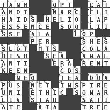 ACROSS 1. Hyperbolic tangent 5. Elect 8. Feline 11. Mine, in Marseilles 12. Drug cop 14. Biblical high priest 15. Unmarried girls 17. Sun: prefix 18. Pet locale 19. Core 21. "Barney Miller" actor Jack 22. Cards in a Roman deck? 23. Compass dir. 24. Insect wing 25. Trim (branches) 27. For each 28. "______ My Girl" (Turtles hit) 31. Slit 35. Mountains (abbr.) 37. Root beer relative 38. Food container 39. Ocean 41. Of or related to the anus 42. Against 43. Epoch 45. Monthly bill 46. Peachy ____! 47. Music discs 49. Modern: prefix 51. Beverage made from leaves 52. ___ good deed 55. Fluid product of inflammation 57. Fish or hair follower 60. Stimulate to action 62. Corn or form start 63. Principle of right and wrong 65. Underwater navigation system 66. 54 in ancient Rome 67. Play the lead 68. Suttee (variant) 69. Had dinner 70. "One Day ___ Time" 71. Woody plant DOWN 1. Softens 2. Collect or gather 3. Annoying sound 4. Flintstone garb 5. Single 6. Friends 7. Musical group of three 8. Portable communications device 9. Jai _ 10. Native american tent (variation) 13. Calm and collected 16. Fastener 17. Centers of feelings and intuitions 20. Clement's nick name 26. Motion picture award 29. Liveliness 30. Table seasoning 31. Neighbor of Neb. 32. Actor's bit 33. Clearly or manifestly demonstrative 34. One or ones belonging to thee 36. Perceive with the eye 40. Northern region 44. An important port of Yemen 48. Backtalk 50. Washington bills 52. Middle Eastern gold or silver currency 53. Speak pompously 54. Nest on high 55. Monetary unit of Botswana 56. A single undivided whole 58. Singer James 59. Not this but _ 61. Mail 64. Retirement account (abbr.)