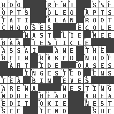 ACROSS 1. Friend of Pooh 4. Painter Guido (1575-1642) 8. Compass dir. 11. Chooses 13. Butter sub 14. Flats, for short 15. Jacques of French films 16. ____ Jay Lerner 17. Carrot, for example 18. Opts 21. Learning spot: Fr. 22. Political cartoonist Thomas 23. Falsehood 25. Born 26. Sound made by sheep 29. One of the two male reproductive glands 32. Slender Brazilian palm 34. One (Scot) 35. Definite Article 38. It's straight from the horse's mouth 39. Swept the length of 41. Connecting point 43. Nonscientific branch of learning 44. Binary compound 45. Fertile tracts in a desert 46. Swallowed 50. Followers of ems 51. Afternoon social gathering 54. Storage container 55. Nights before holidays 57. Sports stadium 59. Nestling 63. Greater amount 64. Froth on beer 67. Length times width 68. Prepare for publication 69. Migrant worker of the '30s 70. A home for chicks 71. Observe 72. Watch over 73. A female animal or person DOWN 1. College mil. group 2. Brightly colored fish 3. "Beetle Bailey" pooch 4. Ridicules or criticizes harshly 5. Pipe bend 6. Teachers' org. 7. Electrically charged atom 8. Soup utensil 9. Fur scarf 10. First name in cosmetics 12. The Jewish people; Israel 14. Curve 19. Suttee (variant) 20. Compass dir. 21. Snakelike fish 23. Actor's bit 24. On the rocks 26. Drinking establishment 27. At sea 28. SW Saudi Arabia district 30. Receives possession of 31. Inactive volcano in Sicily 33. Against 36. Stockings 37. Paradise 39. Swiss mountan, "Queen of the Mountains" 40. Arabian gulf 42. Double-curved letter 45. Lyric poems 47. Basketball assoc. 48. Watched over 49. First lady 51. Softens 52. Eat (away) 53. Nest on high 56. Comedian Laurel of Laurel & Hardy 58. Fish or hair follower 60. Angers 61. Soft 62. Yard entry 64. Being at a high temperature 65. Make supply last 66. The 18th letter of the Arabic alphabet