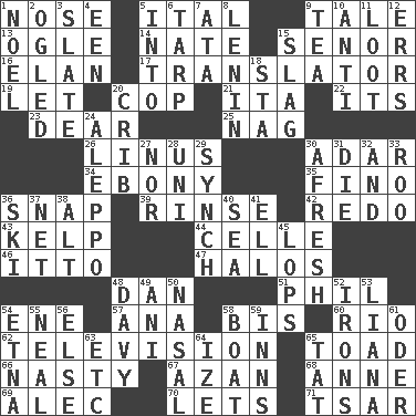 ACROSS 1. Sense of smell 5. Slanted text style (abbr.) 9. Lie 13. Stare at amorously 14. Nathan's nickname 15. Sir (Sp.) 16. Flair 17. Interpreter 19. Allow 20. Police officer (slang) 21. Call ___ day 22. ___ a Wonderful Life 23. Letter starter 25. Tired old horse 26. "_ and Lucy" (Charlie Brown theme song) 30. The sixth month of the Jewish calendar 34. Black 35. A pale, very dry sherry 36. Fastener 39. Remove soap 42. Do over again 43. Seaweed 44. Cell (Danish) 46. "Tell ____ the Marines!" 47. Auras 48. One of the 12 tribes of Israel 51. Silvers or Donahue 54. Compass dir. 57. Santa ___, CA 58. Again 60. River (Sp.) 62. Boob tube 65. Frog relative 66. Offensive 67. Muslim summons to prayer 68. Singer Murray 69. Actor Baldwin 70. Allows 71. Russian ruler of old DOWN 1. Christmas carol 2. Stared 3. Chalkboard 4. Car or cant ending 5. To the inside or interior of 6. Canvas cover 7. _ moment's notice (2 wds.) 8. Soviet premier 1918-24 9. Afternoon social gathering 10. Against 11. Plunder 12. Blunders 15. Volcanic refuse 18. R.R. building 20. Baby bed with high sides 24. City in Syria 27. Or not 28. University (slang) 29. Synchronize (abbr.) 30. Anew 31. Expire 32. Also 33. Friend of Pooh 36. What Jean-Claude Killy likes to do 37. Fish or hair follower 38. The first octave above the treble staff 40. Ocean 41. Pipe bend 45. Chops off 48. American folk hero Crockett 49. Black tropical American cuckoo 50. Rhinal 52. Removes the wrinkles 53. Climbing, woody, usually tropical vines 54. Inactive volcano in Sicily 55. Be tempered by heat 56. Otherwise 58. Water vessel 59. Lodging establishments 61. River in Europe 63. And so on (abbr.) 64. Ending with capital 65. Make lace