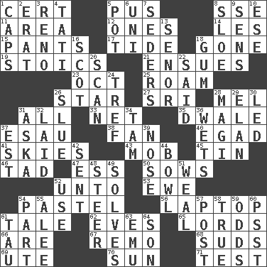 ACROSS 1. Certainty 5. Ichor 8. Compass dir. 11. Length times width 12. Washington bills 14. French article 15. Leg coverings 17. Periodic rise and fall of the sea level 18. Went 19. Unemotional ones 21. Takes place subsequently 23. Sep. follower 25. Wander 26. Play the lead 27. Indian title of respect (Mr.) 28. Cartoonist voice _ Blanc 31. 100% 33. Fish or hair follower 35. A sleeping potion; an opiate (poet.) 37. Son of Isaac 38. Avid follower 40. Mild oath 41. Atmospheres 43. Crowd into 45. Metal container 46. Small boy 47. Double-curved letter 50. Sty mamas 52. To (old English) 53. She-sheep 54. Soft color 56. Portable computer 61. Story 62. Nights before holidays 65. Titled peers of a realm 66. "We ___ not amused" (Victoria) 67. San ____ (Riviera town) 68. Beer foam 69. Shoshoni 70. Player for Phoenix 71. Trial DOWN 1. Smile enhancers 2. Part of Q.E.F. 3. Western Nevada city 4. Jacques of French films 5. Cooking vessel 6. Single; one (prefix) 7. Spring feasts 8. A type of plum 9. Elected reps. 10. Compass dir. 13. Sir (Sp.) 16. Native of Scotland 18. Chewing product 20. Examine minutely or intensely 22. Alleged 24. Not kosher 26. Turn sharply 28. Wise men 29. Flair 30. Directed 31. "____ silly question..." 32. Put down 34. Scottish cap 36. Moistens 37. Eastern Standard Time (abbr.) 39. Sense of smell 42. Transmitted 44. Soup holder 48. Navigate 49. Finds the solution 51. Welt 52. Purpose 54. Component 55. Toward shelter 57. Mail 58. Loyal 59. Likelihood 60. Inconspicuous attention getter 61. The 19th letter of the Greek alphabet 63. Australian flightless bird 64. Male child