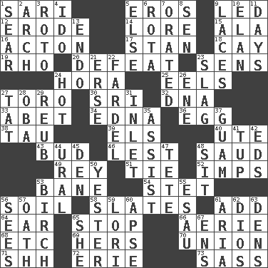 ACROSS 1. Indian skirt 5. Greek god of love 9. Directed 12. Eat (away) 14. Old wives' tales, e.g. 15. According to 16. NE Massachussets city 17. Comedian Laurel of Laurel & Hardy 18. Island 19. 17th letter of the Greek alphabet 20. Outscore 23. Elected reps. 24. Israeli folk dance 25. Snakelike fish 27. "Corrida" creature 30. Indian title of respect (Mr.) 32. Heredity factor (abbr.) 33. Collude with 34. Pulitzer Prize-winning author Ferber 36. Ovum 38. The 19th letter of the Greek alphabet 39. Raised railways 40. Shoshoni 43. Partially opened flower 46. For fear that 48. Saudi Arabian king (1953-1964) 49. Marina Del _, California 51. Make a knot 52. Naughty children 53. Object of repulsion 54. Proofreading order 56. Land 58. Chalkboards 61. Find the sum of 64. Ewer handle 65. Constrict 66. Nest on high 68. And so on (abbr.) 69. Possessive pronoun 70. The state of being joined or united 71. Quiet! 72. 4th largest of the Great Lakes 73. Backtalk DOWN 1. Dry up 2. Bowlike part 3. Printing process, for short 4. Wedding promise 5. Otherwise 6. Round or rotation of duties 7. Declaimed 8. Elected rep. 9. Shoestrings 10. Flair 11. 24-hour periods 13. Inside; within (prefix) 21. Celtic language 22. Burden 23. Volcanic refuse 24. Being at a high temperature 26. Compass dir. 27. Make lace 28. Chief or king in Benin or Nigeria 29. Reuben's nickname 31. An arm off of a larger body of water 35. Help 37. Island territory of the United States 41. Uncastrated adult male sheep 42. Begley and Asner 44. Mountain range 45. Lair 47. False hair 48. Be seated 50. Of or pertaining to yesterday 53. A tree used for making furniture 55. He sold his birthright 56. Observes 57. Pledge 59. Australian parrot (variant) 60. Domed church section 61. Roberta Peters solo 62. "Vaya con ____" 63. Cub Scout units 65. A female animal or person 67. Followers of ems