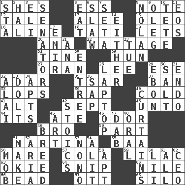 ACROSS 1. "______ My Girl" (Turtles hit) 5. Double-curved letter 8. Musical sound 12. Falsehood 13. Toward shelter 15. Butter sub 16. Place in a line 18. Jacques of French films 19. Allows 20. Wet nurse (var.) 22. Electrical Measurement 24. Prong on a fork 26. Attila the _ 27. Northwest Algerian city 28. Area sheltered from the wind 29. Compass dir. 32. The sixth month of the Jewish calendar 35. Russian ruler of old 37. Prohibit 38. Chops off 39. Reproach for some lapse or misdeed 40. Lacking warmth 41. The first octave above the treble staff 42. Back-to-school mo. 43. To (old English) 44. ___ a Wonderful Life 45. Had dinner 46. Aroma 49. Sis' sibling 50. Component 51. Chrissie's court nemesis 55. Sound made by sheep 56. Female horse 57. Root beer relative 59. Pale purple color 63. Migrant worker of the '30s 64. Clip 65. The longest river in the world 66. Necklace unit 67. Baseball player Mel 68. Grain storage tower DOWN 1. R.R. building 2. Actor Linden 3. Connecticut Ivy Leaguer 4. Legislators 5. Ingest 6. Cole _ (cabbage dish) 7. Stalk of a moss capsule 8. Pitcher Ryan 9. Cassini of fashion 10. Wig 11. Greek goddess of the dawn 14. One or the other 17. Arab leader 21. Santa ___, CA 23. Third day of the wk. 25. Main course 28. Portable computer 29. Inky black, to poets 30. Table seasoning 31. Inside; within (prefix) 32. Mountain range southwest of Kyrgyzstan 33. Stupid person 34. Tenement units (abbr.) 36. Plant excrement 40. Window treatments 42. Unemotional ones 45. Nonscientific branch of learning 47. Apply (a substance) by light strokes 48. Taken by mouth 49. A special lineage 51. Create 52. Roberta Peters solo 53. Words to Nanette 54. Came down and settled, as after flight 56. Disorderly crowd 58. Fitting 60. Cards in a Roman deck? 61. Everything 62. Corporate head (abbr.)