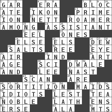 ACROSS 1. Slender fish 4. Epoch 7. Alliance 11. Had dinner 12. Picture 13. First class 14. Electrically charged atom 15. Remaining after all deductions 16. Wanderer 17. Amid 19. Aide 21. Snakelike fish 23. Washington bills 24. Otherwise 25. Raised railways 26. Morning condensation 29. Table seasonings 30. To separate or throw off 31. Sight organ 32. Atmosphere 33. Indiana (abbr.) 34. Tate display 35. Mature 36. _-fi 37. A sleeping potion; an opiate (poet.) 40. Plus 41. Area sheltered from the wind 42. Political cartoonist Thomas 43. Examine hastily 45. "We ___ not amused" (Victoria) 46. Decision 51. Women servants 55. Foolish or stupid persons 56. For fear that 58. Afternoon social gathering 59. Having high moral qualities 60. Thin strip of wood or metal 61. Followers of ems 62. Celtic language 63. According to 64. Mountains (abbr.) DOWN 1. Greek goddess of the earth (variant) 2. Smallest unit of an element 3. Western Nevada city 4. Make supply last 5. Round or rotation of duties 6. Pismires 7. Naughty children 8. Pale green bean 9. Sign of things to come 10. An absolute certainty 12. Consume 13. Introduce or present, as a question 16. Wash lightly 18. 1994 drama film starring Jodie Foster 20. Having a sole or soles 22. French article 24. Having ears or earlike features 25. Bert's buddy 26. Started a card game 27. Jane of fiction 28. Soggy 29. Attach a signature 32. American Automobile Association (abbr.) 33. Ancient Celtic tribe of eastern Britain 36. Narrow boards 37. Heredity factor (abbr.) 38. Heat 39. Toward the sea 43. Took without asking 44. Quote 46. Trig term 47. Scent 48. Chest bones 49. Spanish pot 50. Anneal 52. A whole individual unit 53. Gouge 54. Backtalk 57. R.R. building