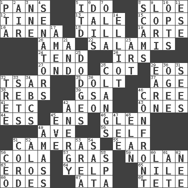 ACROSS 1. Baking dishes 5. Wedding promise 8. _ gin 12. Prong on a fork 13. Story 15. 911 reaches them 16. Sports stadium 18. Deli pickle 19. Johnson of "Laugh-In" 20. Housemaid (var.) 22. Deli grouping 24. Be inclined (to) 26. Big collection agency 27. Southwest Nigerian state 28. Small bed 29. Greek goddess of the dawn 32. Russian ruler of old 35. Dunce 37. Ripen 38. Confederate soldiers (slang) 39. Girls' org. (abbr.) 40. Algonquian 41. And so on (abbr.) 42. Period of immesurable duration 43. Washington bills 44. Curvy letter 45. Followers of ems 46. Small, secluded valley 49. "___ Maria" 50. Automatically 51. Devices for capturing images 55. Hearing organ 56. Root beer relative 57. Pate de foie ____ 59. Pitcher Ryan 63. Greek god of love 64. Sharp bark 65. Mediterranean tributary 66. Lyric poems 67. "One Day ___ Time" 68. Wig DOWN 1. Parent Teacher Assoc. 2. Wind 3. Compass dir. 4. Elected representatives 5. It would 6. Raised platform 7. Spanish pot 8. Fraudulent business schemes 9. Australian parrot (variant) 10. Chooses 11. Compass dir. 14. American author Paul (1891-1958) 17. So be it 21. Also 23. Nonscientific branch of learning 25. Evades 28. Rigngs loudly 29. Merit 30. Double curve, resembling the letter S 31. Perceives with the eye 32. Woody plant 33. Arranges properly for use 34. Lettered men learn these first 36. Bear (Spanish) 40. Meet 42. Disorder of the immune system 45. First lady 47. Area sheltered from the wind 48. Liveliness 49. Collect or gather 51. Drawstring 52. Medicinal plant 53. Length times width 54. Table seasoning 56. Corporate head (abbr.) 58. Health resort 60. Falsehood 61. Keyboard modifier key 62. Born