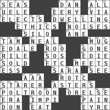 ACROSS 1. Oceans 5. Daniel's nick name 8. Everything 11. Ubangi River tributary 12. Suggestive of the supernatural 13. By way of 14. Chooses 17. Residence 19. Moral principles 21. Annoying sounds 22. Grain storage tower 23. One (Scot) 24. Scottish cap 27. Be tempered by heat 29. Large cup 32. Peak District village in England 34. Friend of Pooh 36. Went 37. Cause heat under the collar 38. Distress signal 39. Singer Brickell 40. Disposed of to a purchaser 41. And so on (abbr.) 42. Confronts 43. Double-curved letter 44. "Two Mules for Sister ____" 46. Observe 47. Auto club (abbr.) 50. College mil. group 52. A viewer who gazes fixedly 55. Michaelmas daisies 57. Coward 59. Threatening words 62. Epoch 63. Body of Kaffir warriors 64. Ache 65. Spanish title 66. Erode 67. Jane of fiction DOWN 1. Take to court 2. Snakelike fish 3. Toward shelter 4. Religious groups 5. Morning condensation 6. Sports stadium 7. Thermoplastic polyamide 8. Opinion 9. Actor's bit 10. Falls behind 12. Begley and Asner 15. One or ones belonging to thee 16. Filth; sediment 18. Falsehood 20. Rough 24. Laconic 25. Goodbye (Sp.) 26. Shopping centers 28. Plunders 29. Methods 30. Join together 31. Honkers 33. Directed 35. Motion picture awards 36. Unit of force equal to gravity 42. Mother 45. Printing process, for short 47. Nonscientific branch of learning 48. Nest on high 49. Scent 51. Streamer paper 52. Hurried 53. "Corrida" creature 54. ____ Jay Lerner 55. Black tropical American cuckoo 56. Kill 58. Elect 60. Title for a knight 61. Compass dir.