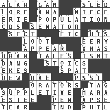 ACROSS 1. Having or resembling wings 5. Separate the seeds from cotton 8. Downhill vehicle 12. Old wives' tales, e.g. 13. Santa ___, CA 14. Sibling's daughter 15. 4th largest of the Great Lakes 16. Census information 19. Music discs 20. Legislator 21. Religious group 23. And so on (abbr.) 24. Part of HMS, perhaps 27. Plunder 30. Suggestive of the supernatural 31. Become visible 34. Dec. holiday 35. Northwest Algerian city 38. Falsehoods 40. Is not 41. Mild oath, euphamism for damn 42. Unemotional ones 44. Supplements with great effort 45. Petty quarrel 46. Morning condensation 47. Actress Charlotte 50. Inconspicuous attention getter 53. Speakers 57. Label 59. Supplying deficiencies 63. Hindu Mythology: god of death 64. First name in cosmetics 65. Writing instrument 66. Domed church section 67. Rend 68. Working for oneself (abbr.) 69. Silvers or Donahue DOWN 1. Actor Baldwin 2. Domineers 3. Originate 4. To sift 5. Yawn 6. At once, immediately (arch.) 7. California wine valley 8. Be seated 9. Luau accessory 10. Environmental prefix 11. Lair 14. Drug cop 17. Shoshoni 18. Car dealer's back yard 20. Obstruct or block passage 22. Rigngs loudly 24. Is hesitant and indecisive 25. SW Asia republic 26. System (abbr.) 28. Elect 29. Afternoon social gatherings 30. Has an existence 32. Keyboard modifier key 33. Vintage cars 35. Wrote a lyric poem 36. Immoral or dissolute person 37. Afresh 39. Small drink 43. Balmoral and tarboosh 47. Hero or heavy, e.g. 48. "We ___ not amused" (Victoria) 49. Consume 51. Staphylococcus 52. Tarsus (plural) 54. Native american tent (variation) 55. Baking chamber 56. Tear apart 58. Highlander 59. Put into a specified state 60. Purpose 61. Parent Teacher Assoc. 62. For each 63. Atlas unit