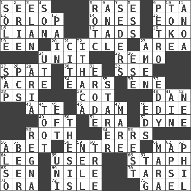 ACROSS 1. Perceives with the eye 5. Raze (variant) 9. Parent Teacher Assoc. 12. Fourth or lowest deck 14. Washington bills 15. Age 16. Woody, climbing, usually tropical plant 17. Small amounts or degrees 18. Ring climax 19. Car or cant ending 20. Hanging ice 23. Length times width 24. A single undivided whole 25. San ____ (Riviera town) 27. Petty quarrel 30. Definite Article 32. Compass dir. 33. 43,560 square feet 34. Hearing organs 36. Compass dir. 38. Air pressure measure (abbr.) 39. Small bed 40. Daniel's nick name 43. Had dinner 46. First of billions? 48. Singer Brickell 49. Often (poetically) 51. Epoch 52. Unit of force 53. Writer of Portnoy's Complaint (1969) 54. Blunders 56. Collude with 58. Main course 61. Atlas unit 64. Part of a journey 65. One who makes use of a thing 66. Staphylococcus 68. Elected rep. 69. The longest river in the world 70. Tarsus (plural) 71. Mouth or opening 72. Small island 73. Highlander DOWN 1. Flatfish 2. One of the Great Lakes 3. Liveliness 4. Male child 5. College mil. group 6. Of or related to the anus 7. Spring feasts 8. Double-curved letter 9. Stone: prefix 10. Puff or smoke 11. Small Philippine buffalo 13. Ache 21. Quote 22. New York city 23. So be it 24. Shoshoni 26. Compass dir. 27. Plant excrement 28. Personal Computers (abbr.) 29. Roberta Peters solo 31. Eat (away) 35. A viewer who gazes fixedly 37. Whirlpool 41. The 18th letter of the Arabic alphabet 42. Born 44. A blast of a horn 45. Newt 47. Female horse 48. Begley and Asner 50. College paper 53. Rain (Swedish) 55. Relief 56. In addition 57. Fermented drink made from hops 59. 1994 drama film starring Jodie Foster 60. Relationship diagram 61. Hindu Mythology: god of death 62. Domed church section 63. Silvers or Donahue 65. University (slang) 67. Label