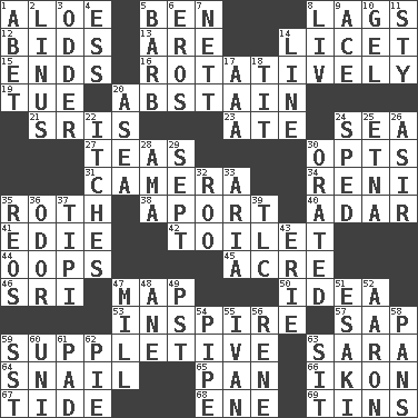 ACROSS 1. _ vera 5. Benjamin's nick name 8. Fails to keep up a pace 12. Auction offers 13. "We ___ not amused" (Victoria) 14. It is permitted: Lat. 15. Conclusions 16. Happening in regular succession 19. Third day of the wk. 20. Refrain by choice 21. Indian titles of respect 23. Had dinner 24. Ocean 27. Beverages made from leaves 30. Chooses 31. Device for capturing images 34. Painter Guido (1575-1642) 35. Writer of Portnoy's Complaint (1969) 38. To the left, to Queeg 40. The sixth month of the Jewish calendar 41. Singer Brickell 42. Bathroom plumbing fixture 44. I made a mistake 45. Land measure 46. Indian title of respect (Mr.) 47. Atlas unit 50. The content of cognition 53. Heighten or intensify 57. Plant excrement 59. Supplementary 63. "Two Mules for Sister ____" 64. Slow-paced one 65. Baking dish 66. Visual representation of an object 67. Event that recurs at intervals 68. Compass dir. 69. Canisters DOWN 1. Collude with 2. "_ and Lucy" (Charlie Brown theme song) 3. More peculiar 4. Curvy letter 5. Sharp remark 6. Greek god of love 7. Remaining after all deductions 8. 54 in ancient Rome 9. Adept person 10. Set 11. Filthy place 14. Actor's bit 17. Auto club (abbr.) 18. Teat (slang) 20. Toward the sea 22. Irritating cutaneous sensations 24. Drove too fast 25. Inactive volcano in Sicily 26. SW Saudi Arabia district 28. Nursemaid (var.) 29. Back-to-school mo. 30. Spoke pompously 32. Friend of Pooh 33. Roberta Peters solo 35. Vintage cars 36. Aroma 37. Native american tent (variation) 39. Affectionate concern, for short 43. 4th largest of the Great Lakes 47. Place where flour is made 48. One (Scot) 49. Pacific Standard Time (abbr.) 51. 1973 Nobel Price Winner (Physics) Leo 52. Composer Copland 54. Corncob 55. "Terrible" tsar 56. French philosopher Descartes 58. Zero-star reviews 59. Fast jet (abbr.) 60. Corn or form start 61. Groovy apt. 62. Sliced dessert 63. Be seated