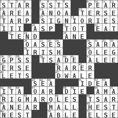 ACROSS 1. Play the lead 5. Fast planes 9. Lightbulb-shaped fruit 13. Length times width 14. Small Philippine buffalo 15. Laconic 16. Canvas cover 17. Seigniories (variant) 19. One more than two 20. Viper 21. Small child 22. Ingest 23. Be inclined (to) 25. A saturated hydrocarbon 26. Fertile tracts in a desert 30. "Two Mules for Sister ____" 34. From or relating to Ireland 35. Cassini of fashion 36. Global Positioning Systems (abbr.) 39. Sadhe (variant) 42. Toward shelter 43. Celtic language 44. More uncommon 46. Allows 47. A sleeping potion; an opiate (poet.) 48. Ocean 51. It may be bright or harebrained 54. Call ___ day 57. Rowing implement 58. Expire 60. Nanny (var.) 62. Frustrating wastes of time 65. Russian ruler of old 66. Approach 67. Promenade 68. Command 69. Egg locale 70. Competent 71. Otherwise DOWN 1. Suttee (variant) 2. Distinguishing feature 3. Nest on high 4. Strike 5. Backtalk 6. Clip 7. Coat; cloak 8. Before Barbara or Clara 9. For each 10. 4th largest of the Great Lakes 11. At sea 12. Repose 15. Carryall 18. Electrically charged atom 20. The sixth month of the Jewish calendar 24. Annoying sounds 27. Be seated 28. Curvy letter 29. Broken piece 30. Flew 31. Everything 32. To riddle 33. Grow older 36. Set 37. Before (prefix) 38. Fast jet (abbr.) 40. Simpleton 41. Period 45. Writer Wiesel 48. Fly high 49. Hearing organ 50. Scent 52. Artist's stand 53. Collect or gather 54. SW Asia republic 55. Prong on a fork 56. Ripens 58. Small valley 59. Small island 61. Johnson of "Laugh-In" 63. Floor protector 64. Experiment locale 65. Definite Article