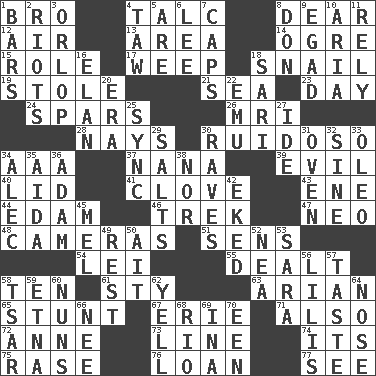 ACROSS 1. Sis' sibling 4. Baby powder 8. Letter starter 12. Atmosphere 13. Type of rug 14. Legendary monster 15. Hero or heavy, e.g. 17. Shed a tear 18. Slow-paced one 19. Fur scarf 21. Ocean 23. 24 hours 24. Practice fights 26. Medical imaging device (abbr.) 28. Negative votes 30. Boisterous (Brazilian Portuguese) 34. Auto club (abbr.) 37. Nanny 39. Tending to cause great harm 40. Flaplike covering 41. Garlic unit 43. Compass dir. 44. Dutch treat 46. Long journey 47. Modern: prefix 48. Devices for capturing images 51. Elected reps. 54. Luau accessory 55. Started a card game 58. "___ Little Indians" 61. Filthy place 63. Believer in; advocate of (suffix) 65. Check the growth or development of 67. One of the Great Lakes 71. In addition 72. Queen of England 1702-14 73. Actor's bit 74. ___ a Wonderful Life 75. Raze (variant) 76. Grant temporary use of 77. Observe DOWN 1. Soap units 2. Disturbances 3. Fourth or lowest deck 4. The 23rd letter of the Hebrew alphabet 5. "We ___ not amused" (Victoria) 6. Area sheltered from the wind 7. Balmoral and tarboosh 8. Spanish title 9. Mild oath 10. Operatic vocal solo 11. Depend 16. Liveliness 18. Indian skirt 20. Epoch 22. Australian flightless bird 25. Synchronize (abbr.) 27. Binary compound 29. Table seasonings 30. All-night dance parties 31. Baking chamber 32. Trig term 33. Margarine 34. Actor Baldwin 35. Opera by Verdi 36. First of billions? 38. Not either 42. Made supply last 45. Cartoonist voice _ Blanc 49. Take ten 50. Small island 52. Teachers' org. 53. "Two Mules for Sister ____" 56. Ms. Damita and namesakes 57. Clothes sense 58. Russian ruler of old 59. Inactive volcano in Sicily 60. Religious women 62. Shout 64. Characteristic smell of wine 66. Born 68. River (Sp.) 69. _ tizzy (2 wds.) 70. Car or cant ending