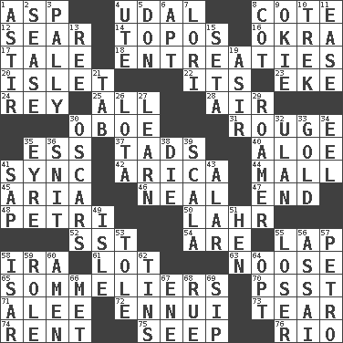 ACROSS 1. Cleo's killer 4. Freehold land 8. ____ d'Azur (French Riviera) 12. Scorch 14. Traditional theme or motif 16. Gumbo ingredient 17. Story 18. Pleas 20. Small island 22. It is 23. Supplement with great effort 24. Marina Del _, California 25. Everything 28. Wind 30. Mitch Miller's instrument 31. Makeup applied to the cheeks 35. Double-curved letter 37. Small boys 40. Medicinal plant 41. Synchronize (abbr.) 42. N. Chile seaport 44. Promenade 45. Roberta Peters solo 46. Be tempered by heat 47. Conclude 48. _ dish (used to culture cells) 50. Cowardly lion portrayer 52. Fast jet (abbr.) 54. "We ___ not amused" (Victoria) 55. Infant locale 58. Lyricist Gershwin 61. Car dealer's back yard 63. Trap for birds or small mammals 65. Wine waiters 70. Inconspicuous attention getter 71. Toward shelter 72. World-weariness 73. Separate forcefully 74. Monthly bill 75. Ooze 76. _ de Janeiro DOWN 1. Moving or stirring 2. Gospel singer Marvin 3. Friendly 4. Shoshoni 5. Spanish title 6. Fitting 7. Australian parrot (variant) 8. Small bed 9. Migrant worker of the '30s 10. Long journey 11. Relaxation 13. To separate or throw off 15. Stalk of a moss capsule 19. SW Saudi Arabia district 21. Keyboard key 26. Globular water bottle used in Asia 27. Memorize 29. Nomad 30. Motion picture awards 32. ____ Bator, Mongolia 33. Aureate 34. Snakelike fish 35. Jane of fiction 36. In a ____ (agitated or irritated) 38. Expire 39. Any of the three canals of the cochlea 41. Plant excrement 43. Having or resembling wings 49. Small island 51. Layer 53. Lacquered or enameled metalware 55. Failure 56. Slender Brazilian palm 57. Stone: prefix 58. Austrian river, tributary to the Danube 59. Hero or heavy, e.g. 60. So be it 62. Metal containers 64. Elect 66. Was introduced to 67. Compass dir. 68. Regret 69. Small drink
