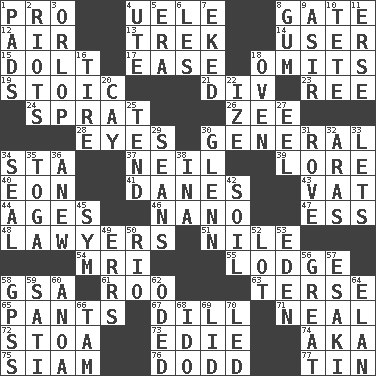 ACROSS 1. Adept person 4. Ubangi River tributary 8. Yard entry 12. Wind 13. Long journey 14. One who makes use of a thing 15. Dunce 17. Comfort 18. Leaves out 19. Unemotional 21. HTML Container Element 23. To sift 24. Small fatty European fish 26. Last letter of the English alphabet 28. Sight organs 30. Commissioned military rank 34. R.R. building 37. Famous astronaut Armstrong 39. Old wives' tales, e.g. 40. Period of immesurable duration 41. Natives or inhabitants of Denmark 43. Large container 44. Eras 46. Billionth: prefix 47. Curvy letter 48. Those who practice law 51. Mediterranean tributary 54. Medical imaging device (abbr.) 55. Cabin 58. Girls' org. (abbr.) 61. Friend of Pooh 63. Laconic 65. Leg coverings 67. Deli pickle 71. Actress Patricia 72. Portico 73. Singer Brickell 74. Alias (abbr.) 75. Thailand, formerly 76. Texas town _ City 77. Shallow baking pan DOWN 1. Writing tablets 2. Disturbances 3. Fourth or lowest deck 4. Shoshoni 5. Period 6. French article 7. Supplemented with great effort 8. Chewing product 9. SW Saudi Arabia district 10. False hair 11. Celtic language 16. Become fatigued 18. Baking chamber 20. Island 22. Ending with capital 25. Look after 27. Snakelike fish 29. Actors Connery and Penn 30. American astronaut and politician John 31. Be footloose 32. Caspian sea tributary 33. Allows 34. Lick closed 35. Ancient Roman robe 36. Afresh 38. _ tizzy (2 wds.) 42. Earth 45. Symbol (abbr.) 49. Blunders 50. _ de Janeiro 52. Car dealer's back yard 53. Paradise 56. Relatively large 57. 1973 Nobel Price Winner (Physics) Leo 58. Global Positioning Systems (abbr.) 59. Suttee (variant) 60. Small Philippine buffalo 62. Wrote a lyric poem 64. Enthusiasm 66. Scottish cap 68. Wedding promise 69. Hat (slang) 70. Directed