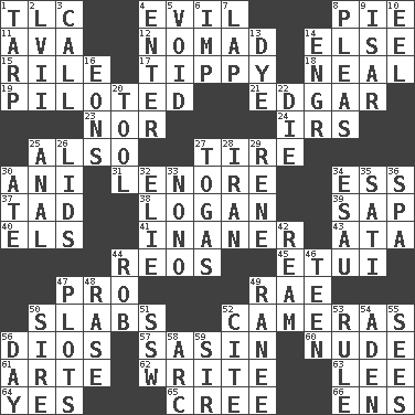 ACROSS 1. Affectionate concern, for short 4. Tending to cause great harm 8. Sliced dessert 11. Actress Gardner 12. Roamer 14. Otherwise 15. Cause heat under the collar 17. Likely to tip or tilt 18. Anneal 19. Manned the helm 21. _ Allan Poe 23. Not either 24. Big collection agency 25. In addition 27. Hoop that covers a wheel 30. Cuckoo 31. Poe poem 34. Curvy letter 37. Small amount or degree 38. Utah city north of Ogden 39. Plant excrement 40. Raised railways 41. Sillier 43. "One Day ___ Time" 44. Vintage cars 45. Needle case 47. Adept person 49. Actress Charlotte 50. Thick slices 52. Devices for capturing images 56. "Vaya con ____" 57. Indian antelope 60. Naked 61. Johnson of "Laugh-In" 62. Compose 63. Area sheltered from the wind 64. Consenting reply 65. Algonquian 66. Followers of ems DOWN 1. Canvas cover 2. 57 in ancient Rome 3. Give a ring to 4. Keyboard key 5. Empty area or space 6. Naughty child 7. Pet locale 8. Entreaties 9. Austrian river, tributary to the Danube 10. Snakelike fish 13. Color 14. Engineer (abbr.) 16. Immeasurably long periods of time 20. Instrument 22. Expire 25. Of or related to the anus 26. Hats (slang) 27. Ancient Roman robes 28. SW Asia republic 29. French philosopher Descartes 30. Had dinner 32. Writer Wiesel 33. Words to Nanette 34. He sold his birthright 35. Suttee (variant) 36. Health resort 42. 480, 500 or 516 sheets of paper 44. Director Reiner 46. Adolescent 47. Small pieces of grounds 48. Raze (variant) 49. Indian princess (variant) 50. Title for a man of rank and authority 51. Compass dir. 52. Quote 53. General guideline 54. Arabian gulf 55. Observes 56. 24 hours 58. Curve 59. Title for a knight