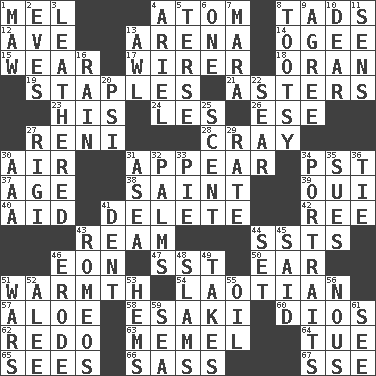 ACROSS 1. Cartoonist voice _ Blanc 4. Smallest unit of an element 8. Small amounts or degrees 12. "___ Maria" 13. Sports stadium 14. Double curve, resembling the letter S 15. Put on (as clothing) 17. One who wires 18. Northwest Algerian city 19. Paper fasteners 21. Michaelmas daisies 23. Part of HMS, perhaps 24. French article 26. Compass dir. 27. Painter Guido (1575-1642) 28. Supercomputer manufacturer 30. Wind 31. Become visible 34. Pacific Standard Time (abbr.) 37. Ripen 38. Inhabitant of Heaven 39. Fr. "Yes" 40. Assist 41. Erase 42. To sift 43. 480, 500 or 516 sheets of paper 44. Fast planes 46. Period of immesurable duration 47. Fast jet (abbr.) 50. Ewer handle 51. Heat 54. Of or relating to Laos or its people 57. Medicinal plant 58. 1973 Nobel Price Winner (Physics) Leo 60. "Vaya con ____" 62. Make new 63. Klaipeda city 64. Third day of the wk. 65. Perceives with the eye 66. Backtalk 67. Compass dir. DOWN 1. Informal term for the mouth 2. Nights before holidays 3. Resembling or made to resemble leather 4. Satellite of Uranus 5. Laconic 6. Single 7. Hindu Mythology: god of death 8. A girl or young woman (variant) 9. Match 10. Letter starter 11. Elected reps. 13. Leather borer 16. Precipitation 20. Air pressure measure (abbr.) 22. Singe 25. Aroma 27. Swiss mountan, "Queen of the Mountains" 29. Assign a rank or rating to 30. American Automobile Association (abbr.) 31. At sea 32. Insides of hands 33. Sliced dessert 34. Likenesses of persons 35. Institutes legal proceedings 36. Make a knot 41. Scratch 43. Lover boys 44. Put into a specified state 45. Expressed in words 46. Wear away 48. Criticizes harshly 49. Proceeds 51. Armed conflicts 52. Toward shelter 53. Is hesitant and indecisive 55. Lubricate 56. Good sense 59. Ocean 61. Perceive with the eye