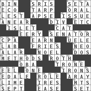 ACROSS 1. Storage container 4. Indian titles of respect 8. Bristle 12. Environmental prefix 13. Canvas cover 14. Of the mouth 15. For fear that 17. Domed church section 18. Come out of 19. Approach 21. HTML Container Element 23. And so on (abbr.) 24. Small island 26. Domesticated feline 28. Suggestive of the supernatural 30. Legislator 34. Accounting whiz (abbr.) 37. Merit 39. Ubangi River tributary 40. Experiment locale 41. Strips of potato fried in deep fat 43. Modern: prefix 44. Having or resembling wings 46. Christmas carol 47. Two (Sp.) 48. Modes 51. Writer of Portnoy's Complaint (1969) 54. Chief or king in Benin or Nigeria 55. Marketplace scale 58. Snakelike fish 61. Single 63. Metal shackles 65. Peak District village in England 67. Hero or heavy, e.g. 71. Like ___ of sunshine 72. Welles in "The Third Man" 73. Angers 74. Mountains (abbr.) 75. Back-to-school mo. 76. Comfort 77. Put into a specified state DOWN 1. Actor Lugosi 2. Ancient Celtic tribe of eastern Britain 3. Olfactory organs 4. R.R. building 5. Reproach for some lapse or misdeed 6. Big collection agency 7. Broke a traffic law 8. Mayday 9. Celtic language 10. Tense 11. Actor Baldwin 16. Falsehood 18. "Terrible" tsar 20. To sift 22. Frozen water 25. Not kosher 27. The 19th letter of the Greek alphabet 29. Entertaining tales 30. Contemptuous expression 31. Be inclined (to) 32. Margarine 33. Vintage cars 34. Burrowing marine mollusk 35. Diluted with white 36. Blind as ____ 38. River (Sp.) 42. Narrow, elongated depression 45. 17th letter of the Greek alphabet 49. Mitch Miller's instrument 50. Daniel's nick name 52. Three (prefix) 53. Israeli folk dance 56. Typical models 57. Related on the mother's side 58. Snakelike fish 59. Singer Brickell 60. Desk light 62. 4th largest of the Great Lakes 64. System (abbr.) 66. Allow 68. Mouth or opening 69. French article 70. Compass dir.