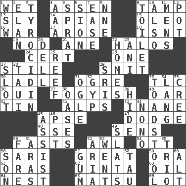 ACROSS 1. Soggy 4. NE Netherlands city 9. Pack (down) 13. Playfully artful 14. Bee-related 15. Margarine 16. Armed conflict 17. Came up 18. Is not 19. Allow head to fall sleepily 21. One (Scot) 22. Radiant circles of light 24. Certainty 26. Single 27. Vertical member of a panel or frame 29. Stricken, poetically 30. Dipping utensil 31. Legendary monster 33. Affectionate concern, for short 36. Fr. "Yes" 37. Out of fashion; old fashioned 40. Boat paddle 41. Shallow baking pan 42. High mountains 43. Silly 45. Domed church section 47. Evade 48. Compass dir. 49. Elected reps. 50. Goes without food and/or water 52. Leather borer 54. Baseball player Mel 56. Indian skirt 57. Relatively large 59. Mouth or opening 61. Mouths or openings 62. National forest in Provo, Utah 63. Lubricate 64. A home for chicks 65. Taiwanese island in East China Sea 66. Car dealer's back yard DOWN 1. Compass dir. 2. Style 3. Polypeptide antibiotic 4. American Automobile Association (abbr.) 5. Small fatty European fish 6. The Jewish people; Israel 7. Comfort 8. Compass dir. 9. Rest room 10. In addition 11. Not women's 12. Cooking vessel 20. Small valley 22. Residences 23. Cuckoo 25. Coral collection 27. Notch 28. "Change" in Tahitian 29. Indian titles of respect 31. Stare 32. Con 33. Inedible or poisonous agaric 34. Austrian-born American filmmaker Fritz 35. Algonquian 38. Fertile tracts in a desert 39. Flintstone garb 44. Words to Nanette 45. Help 46. Pacific Standard Time (abbr.) 49. Narrow boards 50. Conductor's collection 51. Ancient river in northeast Turkey 52. Operatic vocal solo 53. Gone 55. Musical group of three 56. Manchild 57. Chewing product 58. The 19th letter of the Greek alphabet 60. Keyboard modifier key