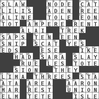 ACROSS 1. Cole _ (cabbage dish) 5. Connecting point 9. Feline 12. Ms. Damita and namesakes 14. An important port of Yemen 15. Portuguese money of account (variant) 16. Place in a line 17. Lacquered or enameled metalware 18. Age 19. Small child 20. Electrical Unit 23. Monthly bill 24. Jai _ 25. Long journey 27. Plant excrements 30. "___ Little Indians" 32. Car or cant ending 33. Sever or remove by pinching or nipping 34. Leave at once 36. It is so 38. Begley and Asner 39. Compass dir. 40. Mamie's mate 43. Possessed 46. "Two Mules for Sister ____" 48. Kill 49. Regret 51. French article 52. Lug 53. The Jewish people; Israel 54. Those people 56. Pale green bean 58. Triplets 61. R.R. building 64. _ moment's notice (2 wds.) 65. Length times width 66. Composer Copland 68. Spoil 69. Take ten 70. The state of being joined or united 71. Shade tree 72. Wig 73. Capri or Wright DOWN 1. Narrow board 2. _ and Stitch 3. Set down 4. Acquire through effort 5. Nathan's nickname 6. Aroma 7. Erase 8. Compass dir. 9. Small stream 10. Age 11. Portable shelter 13. Lick closed 21. Floor coverings 22. Components 23. French philosopher Descartes 24. Viper 26. Marina Del _, California 27. Compass dir. 28. Also 29. Expression of disdain 31. Relating to the nose 35. Cylindrical with tapered ends 37. Grain storage tower 41. Krazy ___ of comics 42. Sight organ 44. Roberta Peters solo 45. Superhero pair 47. American tennis player Robert 48. Filthy place 50. Main course 53. Excessive but superficial compliments 55. He sold his birthright 56. Unable to walk 57. Slanted text style (abbr.) 59. Command 60. Pace 61. Indian titles of respect 62. Implement 63. Singer Murray 65. Tate display 67. Black tropical American cuckoo