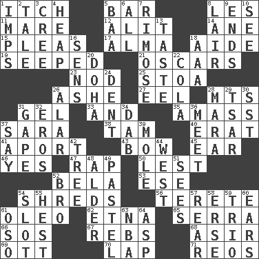 ACROSS 1. Hankering 5. Oblong piece of solid material 8. French article 11. Female horse 12. Came down and settled, as after flight 14. One (Scot) 15. Entreaties 17. _ mater 18. Helper 19. Oozed 21. Motion picture awards 23. Dreamland 25. Portico 26. American tennis player Robert 27. Snakelike fish 28. Mountains (abbr.) 31. Set 33. Plus 35. Collect or gather 37. "Two Mules for Sister ____" 38. Scottish cap 40. Part of Q.E.F. 41. To the left, to Queeg 43. Arrow shooter 45. Ewer handle 46. Consenting reply 47. Reproach for some lapse or misdeed 50. For fear that 52. Actor Lugosi 53. Compass dir. 54. Tears up 56. Cylindrical with tapered ends 61. Butter sub 62. Inactive volcano in Sicily 65. Father Junipero _ 66. Mayday 67. Confederate soldiers (slang) 68. SW Saudi Arabia district 69. Baseball player Mel 70. Infant locale 71. Vintage cars DOWN 1. Naughty children 2. Falsehood 3. Algonquian 4. Pile 5. Sound made by sheep 6. 100% 7. Full of chinks, cracks, or crevices 8. Den 9. Extremities 10. Observe 13. Clothes sense 16. Elected reps. 18. American Automobile Association (abbr.) 20. Capital of the state of Qatar 22. Root beer relative 24. Incision 26. Having or resembling wings 28. Hindu Mythology: god of death 29. Russian ruler of old 30. Fast jet (abbr.) 31. Open wide 32. Greek god of love 34. Apply (a substance) by light strokes 36. Rendezvous 37. Declare 39. Undercover agent 42. Relationship diagram 44. 270 degrees 48. Tree or shrub in the Birch family 49. Soft color 51. Perceives with the eye 52. Sis' sibling 54. Position in a hierarchy or organization 55. Behest 57. Tail end 58. Celtic language 59. Musical group of three 60. Hearing organs 61. Bear (Spanish) 63. Basketball assoc. 64. Viper