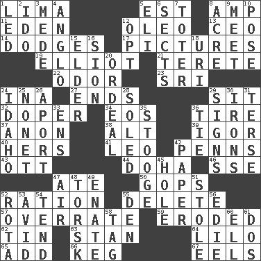 ACROSS 1. Pale green bean 5. Eastern Standard Time (abbr.) 8. Electrical Unit 11. Paradise 12. Butter sub 13. Corporate head (abbr.) 14. Evades 17. Photos 19. American author Paul (1891-1958) 21. Cylindrical with tapered ends 22. Scent 23. _ Lanka 24. _ tizzy (2 wds.) 27. Conclusions 29. Be seated 32. Drug addict 34. Greek goddess of the dawn 36. Become fatigued 37. Soon (poet.) 38. Keyboard modifier key 39. Composer Stravinsky 40. Possessive pronoun 41. Lion 42. Actor Sean's family 43. Baseball player Mel 44. Capital of the state of Qatar 46. Compass dir. 47. Had dinner 50. Republicans 52. Food allowance for one day 55. Erase 57. Make much ado about nothing 59. Worn away 62. Shallow baking pan 63. Comedian Laurel of Laurel & Hardy 64. _ and Stitch 65. Say or write further 66. Barrel 67. Snakelike fish DOWN 1. Directed 2. Wedding promise 3. Ancient Persian 4. White American of non-Hispanic descent 5. Connecticut Ivy Leaguer 6. Religious groups 7. Carrier 8. 1/640 square mile 9. Confront 10. Airs 12. Choose 15. A person who is older than you are 16. The Jewish people; Israel 18. RI univ. 20. Severe or trying experience 24. Potato state 25. Music written for nine 26. To the left, to Queeg 28. Having a sole or soles 29. Omens 30. Removes the wrinkles 31. Laconic 33. Followers of ems 35. Moe Howard, for one 36. Neckwear 42. Some stationery 45. Hollow 47. Atmosphere 48. Cod relative 49. Related on the mother's side 51. Took without asking 52. Round or rotation of duties 53. Enthusiastic 54. Watch over 55. Lair 56. Singer Brickell 58. Label 60. Pipe bend 61. Two (Sp.)