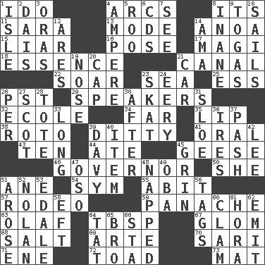 ACROSS 1. Wedding promise 4. Arches 8. It is 11. "Two Mules for Sister ____" 13. Method 14. Small Philippine buffalo 15. One who doesn't tell the truth 16. Introduce or present, as a question 17. Wise men 18. Gist 21. Lessep's creation 22. Fly high 23. Ocean 25. Curvy letter 26. Pacific Standard Time (abbr.) 29. Orators 32. Learning spot: Fr. 34. Distant 35. Mouth edge 38. Printing process, for short 39. Short, simple song 41. Taken by mouth 43. Nine, plus one 44. Had dinner 45. Honkers 46. Head of state? 50. A female animal or person 51. One (Scot) 54. Symbol (abbr.) 55. "This won't hurt ____!" 57. Cowboy competition 59. Flamboyance 63. Norwegian king 64. Cook's measure (abbr.) 67. Seize upon or latch onto something 68. Table seasoning 69. Johnson of "Laugh-In" 70. Indian skirt 71. Compass dir. 72. Frog relative 73. Floor covering DOWN 1. Small island 2. Raised platform 3. Mouths or openings 4. Electrical Unit 5. Friend of Pooh 6. Music discs 7. Perceive with the eye 8. Lacking in sense or substance 9. Ancient Roman robes 10. Moves on water 12. Ancient Greek god of war 14. Nursemaid (var.) 19. Sense of smell 20. Head covering 21. Automobile 23. Three-handed card game 24. Suggestive of the supernatural 26. For each 27. Highlander 28. Lug 30. Following 31. A type of plum 33. Having great length 36. Angers 37. Romantic infatuation 39. American folk hero Crockett 40. A whole individual unit 42. Area sheltered from the wind 45. Smile widely 47. Bear (Spanish) 48. Slept 49. Chief or king in Benin or Nigeria 51. Came up 52. Pitcher Ryan 53. Peak District village in England 56. Labels 58. Newt 60. Burrowing marine mollusk 61. Israeli folk dance 62. Give off 64. Make lace 65. Sis' sibling 66. R.R. building