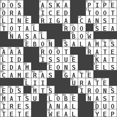 ACROSS 1. Two (Sp.) 4. "____ silly question..." 8. Corncob 12. Mouth or opening 13. On the rocks 14. A blast of a horn 15. Actor's bit 17. Capital of Latvia 18. 2nd pers. sing. pres. of can (arch.) 19. Add up to 21. Friend of Pooh 23. Ocean 24. Rhinal 26. Arrow shooter 28. Inky black, to poets 30. Deli grouping 34. American Automobile Association (abbr.) 37. Carrot, for example 39. Pace 40. Hat (slang) 41. Come out of 43. Krazy ___ of comics 44. Dutch treat 46. Immeasurably long periods of time 47. Raised railways 48. Devices for capturing images 51. Yard entry 54. Cards in a Roman deck? 55. A salt of uric acid 58. Begley and Asner 61. Mountains (abbr.) 63. Removes the wrinkles 65. Taiwanese island in East China Sea 67. Ear part 71. Political cartoonist Thomas 72. Angers 73. Of or related to the anus 74. Superhero pair 75. Wig 76. Welt 77. Slangy assent DOWN 1. Stupid person 2. Constellation of myth 3. Before Barbara or Clara 4. Wind 5. _-fi 6. Cask 7. The sixth month of the Jewish calendar 8. Parent Teacher Association (abbr.) 9. Charged atoms 10. Airs 11. Singer James 16. Comfort 18. Calm and collected 20. Experiment locale 22. Chief or king in Benin or Nigeria 25. Australian parrot (variant) 27. Armed conflict 29. Olfactory organs 30. Feeling sharp psychological pain 31. Create 32. Slanted text style (abbr.) 33. Puts into a specified state 34. Actor Baldwin 35. Opera by Verdi 36. First man 38. Bear (Spanish) 42. He sold his birthright 45. Cartoonist voice _ Blanc 49. Tall New Zealand timber tree 50. Small island 52. Three (prefix) 53. Merit 56. Sycophant 57. Take place subsequently 58. Give off 59. Have the gumption 60. Proofreading order 62. Cole _ (cabbage dish) 64. Halt 66. Compass dir. 68. Single 69. Sound made by sheep 70. Pipe bend