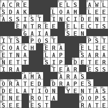 ACROSS 1. Measure of real estate 5. Raised railways 8. Leather borer 11. Neighbor of Neb. 12. Rich soil 13. Area sheltered from the wind 14. Help 17. Happening 19. Main course 21. Chooses 22. Greek goddess of the earth (variant) 23. Elected rep. 24. It is 27. Mail 29. Pacific Standard Time (abbr.) 32. Team commander 34. Epoch 36. Writer Wiesel 37. Inactive volcano in Sicily 38. Infant locale 39. "Two Mules for Sister ____" 40. Remaining after all deductions 41. Small drink 42. Prevent from occurring 43. Lyricist Gershwin 44. Separate forcefully 46. Double-curved letter 47. Nursemaid (var.) 50. Ancient river in northeast Turkey 52. Spoke pompously 55. Window treatments 57. Accusation by an informer 59. Gossips 62. Compass dir. 63. Roll call or roster of names 64. I made a mistake 65. Perceive with the eye 66. Eastern Standard Time (abbr.) 67. Pace DOWN 1. White ___ sheet 2. Music discs 3. To erase 4. Supplementing with great effort 5. Period of immesurable duration 6. Shoestrings 7. Grin 8. Actor Baldwin 9. Left 10. Allows 12. Whopper 15. Staphylococcus 16. Musical group of three 18. Lair 20. Artist's stands 24. Ancient Celtic tribe of eastern Britain 25. Carrier 26. Before Barbara or Clara 28. Distinguishing feature 29. Food holder 30. Titles for men of rank and authority 31. Separates forcefully 33. Feline 35. Seem 36. Compass dir. 42. Window treatment 45. Like ___ of sunshine 47. _ moment's notice (2 wds.) 48. Distance measurement (Brit.) 49. Goodbye (Sp.) 51. Sir (Sp.) 52. Lyric poems 53. French philosopher Descartes 54. Toward shelter 55. Heredity factor (abbr.) 56. Portico 58. Baseball player Mel 60. Fitting 61. Compass dir.