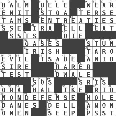ACROSS 1. Lip ointment 5. Ubangi River tributary 9. Put on (as clothing) 13. Send forth 14. Portico 15. Laconic 16. Scottish caps 17. Pleas 19. Compass dir. 20. Retirement account (abbr.) 21. Pipe bend 22. Consume 23. Fast planes 25. Pass on 26. Fertile tracts in a desert 30. Make senseless or dizzy 34. From or relating to Ireland 35. Pacific island yam 36. Tending to cause great harm 39. Sadhe (variant) 42. Among 43. Title for a man of rank and authority 44. More uncommon 46. Trial 47. A sleeping potion; an opiate (poet.) 48. Mayday 51. Indian titles of respect 54. Mouth or opening 57. Actor Linden 58. Mamie's mate 60. To free from 62. Unrelated to defense, as in spending 65. Undercover agent 66. Natives or inhabitants of Denmark 67. Small valley 68. Soon (poet.) 69. Presage 70. Ooze 71. Inconspicuous attention getter DOWN 1. Stakes 2. Collect or gather 3. Citrus fruits 4. Mountains (abbr.) 5. One who makes use of a thing 6. Inactive volcano in Sicily 7. Car dealer's back yard 8. Having ears or earlike features 9. Dripping 10. One of the Great Lakes 11. At sea 12. Remainder 15. Falsehood 18. Biblical high priest 20. Austrian river, tributary to the Danube 24. Bathroom plumbing fixture 27. Be seated 28. Curvy letter 29. Pottery fragment 30. A viewer who gazes fixedly 31. Scottish cap 32. RI univ. 33. Lower and raise head in agreement 36. Eastern Standard Time (abbr.) 37. Compete 38. Big collection agency 40. Simpleton 41. Period 45. Otherwise 48. "______ My Girl" (Turtles hit) 49. Clumsy lout 50. Bobsleighs 52. Metal shackles 53. Grain storage towers 54. Southwest Nigerian state 55. Wander 56. Singer Murray 58. Capri or Wright 59. Seaweed 61. Gouge 63. Lair 64. Born 65. Atlas unit