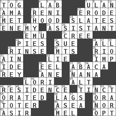 ACROSS 1. Coat; cloak 4. Experiment locale 7. Uhlan (variant) 11. Wet nurse (var.) 12. Painter Guido (1575-1642) 13. Wear away 14. Was introduced to 15. Parka part 16. Chalkboards 17. Foe 19. Helper 21. Australian flightless bird 23. Algonquian 24. Sliced desserts 25. Institute legal proceedings 26. 100% 29. Remove soap 30. Mountains (abbr.) 31. River (Sp.) 32. The 18th letter of the Arabic alphabet 33. Falsehood 34. Mischievous child 35. Binary compound 36. Snakelike fish 37. Phillipine bananalike plant 40. Marina Del _, California 41. A saturated hydrocarbon 42. Grandmother 43. Australian parrot (variant) 45. The first octave above the treble staff 46. Dwelling 51. A color or tint 55. Declaimed 56. Fails to keep up a pace 58. Mouth or opening 59. Carrier 60. At sea 61. And not 62. SW Saudi Arabia district 63. Cartoonist voice _ Blanc 64. Elect DOWN 1. Docile 2. Presage 3. Yard entry 4. Lion 5. Small Philippine buffalo 6. Auction offers 7. A salt of uric acid 8. Globular water bottle used in Asia 9. An important port of Yemen 10. Egg locale 12. Poems 13. Otherwise 16. Titles for men of rank and authority 18. Count _ (2 wds.) 20. Snake scale 22. Purpose 24. Abounding in pines 25. Grin 26. N. Chile seaport 27. Pale green bean 28. Chop off 29. Travel on or in a vehicle 32. Atmosphere 33. Soviet premier 1918-24 36. Having ears or earlike features 37. Santa ___, CA 38. Greek mezzo-soprano Agnes 39. Opposed to 43. 61 cubic inches 44. River in Europe 46. Roll call or roster of names 47. Greek god of love 48. Suttee (variant) 49. Dollar (slang) 50. Relaxation 52. Words to Nanette 53. Riding implement 54. Small pie 57. Set