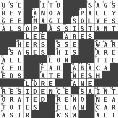ACROSS 1. Purpose 4. It would 7. Droops 11. Marina Del _, California 12. Small Philippine buffalo 13. Chummy 14. Turn to the right 15. Wise men 16. Finds the solution 17. Columnist Joseph or Stewart 19. Aide 21. Area sheltered from the wind 23. Ancient Greek god of war 24. Possessive pronoun 25. Compass dir. 26. Armed conflict 29. Gurus 30. Part of HMS, perhaps 31. "We ___ not amused" (Victoria) 32. Everything 33. Period of immesurable duration 34. Make a knot 35. Corporate head (abbr.) 36. Hearing organ 37. Phillipine bananalike plant 40. Begley and Asner 41. Had dinner 42. Delicate 43. Old wives' tales, e.g. 45. A saturated hydrocarbon 46. Dwelling 51. Inhabitant of Heaven 55. Spoke pompously 56. San ____ (Riviera town) 58. Teachers' org. 59. Hauls 60. Liveliness 61. Auto 62. SW Saudi Arabia district 63. Compass dir. 64. The first octave above the treble staff DOWN 1. Capital and largest city of Mongolia 2. Stitch closed the eyes of (a falcon) 3. Snake ____ (dice throw) 4. _ tizzy (2 wds.) 5. Ancient Roman robe 6. Raised platform 7. Table seasonings 8. Inventor's middle name 9. Small, secluded valley 10. System (abbr.) 12. Electrical Unit 13. Introduce or present, as a question 16. Begets 18. Cassini of fashion 20. Indian antelope 22. Curvy letter 24. Radiant circles of light 25. Dinah or Pauly 26. Timepiece 27. Operatic vocal solo 28. To sift 29. Downhill vehicle 32. Adept person 33. Eroded 36. Having ears or earlike features 37. Santa ___, CA 38. Gillaume's butler role 39. At sea 43. 61 cubic inches 44. Lyric poems 46. Round or rotation of duties 47. Greek god of love 48. Suttee (variant) 49. Ship's personnel 50. Snakelike fish 52. South American Indian 53. Be tempered by heat 54. Small pie 57. Informal term for the mouth
