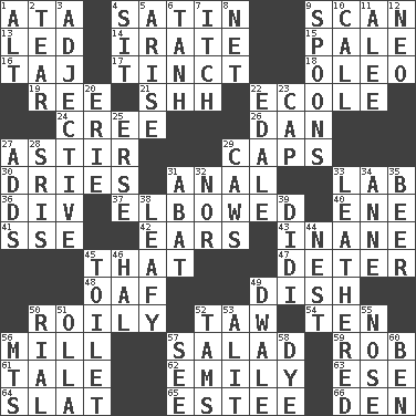 ACROSS 1. "One Day ___ Time" 4. Smooth fabric 9. Glance over 13. Directed 14. Feeling or showing extreme anger 15. Diluted with white 16. _ Mahal 17. Tinged 18. Margarine 19. To sift 21. Quiet! 22. Learning spot: Fr. 24. Algonquian 26. Daniel's nick name 27. Having gotten out of bed 29. Balmoral and tarboosh 30. Frees from moisture 31. Of or related to the anus 33. Experiment locale 36. HTML Container Element 37. Turned at an angle; bent 40. Compass dir. 41. Compass dir. 42. Hearing organs 43. Lacking in sense or substance 45. Not this but _ 47. Prevent from occurring 48. Clumsy lout 49. Food container 50. Turbulent 52. The 23rd letter of the Hebrew alphabet 54. "___ Little Indians" 56. Place where flour is made 57. First course 59. Director Reiner 61. Story 62. Poet Dickinson 63. Compass dir. 64. Narrow board 65. First name in cosmetics 66. Lair DOWN 1. The first octave above the treble staff 2. Lacerate 3. Descriptive word 4. Be seated 5. Ascend 6. Hyperbolic tangent 7. Hankering 8. Fish or hair follower 9. Soup utensils 10. Give a ring to 11. Toward shelter 12. Modern: prefix 20. 4th largest of the Great Lakes 22. Peak District village in England 23. Head covering 25. Celtic language 27. Sums up 28. Indian titles of respect 29. Crow sounds 31. Blind as ____ 32. And not 33. Tough but pliablecoriaceous 34. Singer Murray 35. Fermented drink made from hops 38. Like summer trees 39. "You Light Up My Life" star Conn 44. Egg locale 45. Bathroom 46. Actor Linden 49. A sleeping potion; an opiate (poet.) 50. Monetary unit of Yemen 51. Rounded earthenware pot or jar 52. Scottish caps 53. Came down and settled, as after flight 55. Olfactory organ 56. Mountains (abbr.) 57. Perceive with the eye 58. Color 60. Benjamin's nick name