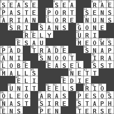 ACROSS 1. Gospel singer Marvin 6. Ocean 9. Actress Charlotte 12. Thick mixture 13. Left side of a ship or aircraft 14. Elected reps. 15. Believer in; advocate of (suffix) 16. Old wives' tales, e.g. 17. Religious women 18. _ Lanka 19. Without 20. Went 21. Trust 23. RI univ. 24. Son of Isaac 25. Catcalls? 28. Writing tablet 30. Exchange 34. Fastener 35. Black tropical American cuckoo 36. Snout, nose 38. Retirement account (abbr.) 39. Ear part 41. Artist's stand 43. Fast jet (abbr.) 44. Promenades 46. Remaining after all deductions 48. Biblical high priest 49. Singer Brickell 50. A single undivided whole 51. Snakelike fish 53. River (Sp.) 56. Margarine 57. Ancient river in northeast Turkey 58. Mexican monetary units 60. Political cartoonist Thomas 61. Male parent of an animal 62. Staphylococcus 63. Followers of ems 64. Animal enclosure 65. Laconic DOWN 1. Health resort 2. Hearing organs 3. SW Saudi Arabia district 4. Flight of steps 5. Car or cant ending 6. Within a short period 7. Blunders 8. Had dinner 9. One who advocates reunion 10. Queen of England 1702-14 11. Double-curved letter 13. Live dramatic performance 14. Sounds asleep 19. Disparaging remarks 20. Chewing product 22. Ingest 24. The property of being fit to eat 26. Armed conflicts 27. Argument over a trivial matter 28. Inside of hand 29. Small Philippine buffalo 31. A saturated hydrocarbon 32. ___ good deed 33. Greek goddess of the dawn 37. Looks after 40. American author Paul (1891-1958) 42. Flowery wreath 45. Be seated 47. Cylindrical with tapered ends 49. Otherwise 50. ____ Bator 51. 4th largest of the Great Lakes 52. Merit 54. Austrian river, tributary to the Danube 55. I made a mistake 56. Single 57. Cleo's killer 58. Pacific Standard Time (abbr.) 59. A female animal or person