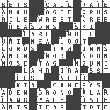 ACROSS 1. Stakes 5. Give a ring to 9. Pace 13. Wet nurse 14. Double curve, resembling the letter S 15. Musical composition 16. Cause heat under the collar 17. Obtain by seizing forcibly or violently 18. Algonquian 19. Thinks logically 21. What Jean-Claude Killy likes to do 22. Conductor's collection 23. Christmas carol 24. University (slang) 27. Teachers' org. 28. Plunder 29. Nobles 31. The 23rd letter of the Hebrew alphabet 32. Restaurants 36. Afresh 37. Disorderly crowd 38. Part of speech 39. Olfactory organ 40. Label 41. Group of southern Bantu languages 42. Cowardly lion portrayer 44. Lyricist Gershwin 46. Fast jet (abbr.) 47. Otherwise 48. Remaining after all deductions 50. By way of 51. Devices for capturing images 54. Arabian gulf 56. U. of Maine site 58. Having or resembling wings 60. Long (Scottish) 61. Diluted with white 62. Capri or Wright 63. Pismires 64. Pull into pieces 65. Haul DOWN 1. Long, evenly shaped piece 2. Arab leader 3. Story 4. Archer's quiver 5. Pupil covering 6. Eras 7. French article 8. Allow 9. Shooting up abruptly 10. Showery time 11. Third day of the wk. 12. Compass dir. 17. Had on 20. Without 21. "Barney Miller" actor Jack 23. Immediately 24. ____ Bator, Mongolia 25. Words to Nanette 26. Angers 28. Experiment locale 30. Homes 31. Coat; cloak 33. Common sense 34. Religious women 35. In a ____ (agitated or irritated) 37. Make imperfect 40. Definite Article 41. Nathan's nickname 43. White ___ sheet 44. More lacking in sense or substance 45. San ____ (Riviera town) 47. Incident 49. Distinguishing feature 51. Root beer relative 52. In addition 53. Table seasoning 54. Wing 55. One of the 12 tribes of Israel 56. Elect 57. Actress Charlotte 59. To sift
