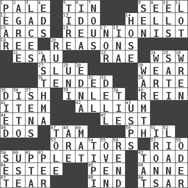 ACROSS 1. Light colored 5. Metal container 8. Stitch closed the eyes of (a falcon) 12. Mild oath 13. Wedding promise 14. Phone greeting 15. Curves 16. One who advocates reunion 19. To separate or throw off 20. Thinks logically 21. Son of Isaac 23. Actress Charlotte 24. Compass dir. 27. Change direction abruptly 30. Erode 31. Watched over 34. Johnson of "Laugh-In" 35. Food container 38. An arm off of a larger body of water 40. It's straight from the horse's mouth 41. A distinct part 42. Plant genus of onion and garlic 44. Inactive volcano in Sicily 45. For fear that 46. Two (Sp.) 47. Scottish cap 50. Silvers or Donahue 53. Speakers 57. River (Sp.) 59. Supplementary 63. Frog relative 64. First name in cosmetics 65. Writing instrument 66. Singer Murray 67. Separate forcefully 68. Indiana (abbr.) 69. Russian ruler of old DOWN 1. Lightbulb-shaped fruit 2. Match 3. Shoestrings 4. Begley and Asner 5. Hoop that covers a wheel 6. The content of cognition 7. Good sense 8. Elected rep. 9. Biblical high priest 10. Raised railways 11. Car dealer's back yard 14. Flexible conduit 17. Or not 18. _ tizzy (2 wds.) 20. Court order 22. Respiratory problem 24. Past tense of be (plural) 25. Suttee (variant) 26. Songbird 28. Corn or form start 29. Pulitzer Prize-winning author Ferber 30. Heat 32. Pipe bend 33. Small valley 35. Passed on 36. "Tell ____ the Marines!" 37. Elected reps. 39. Standoff 43. United States Postal Service (abbr.) 47. Lacquered or enameled metalware 48. "We ___ not amused" (Victoria) 49. Floor protector 51. Removes the wrinkles 52. Woody, climbing, usually tropical plant 54. Native american tent (variation) 55. Baking chamber 56. Tear apart 58. River in Europe 59. Put into a specified state 60. Purpose 61. Parent Teacher Assoc. 62. For each 63. Make lace